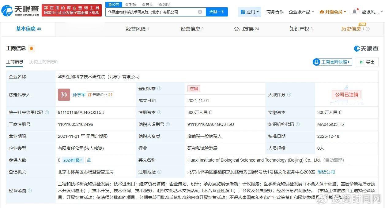 天眼查App显示,近日,华熙生物科学技术研究院(北京)有限公司登记状态由存续变更为注销。此前,该公司已发布简易注销公告。