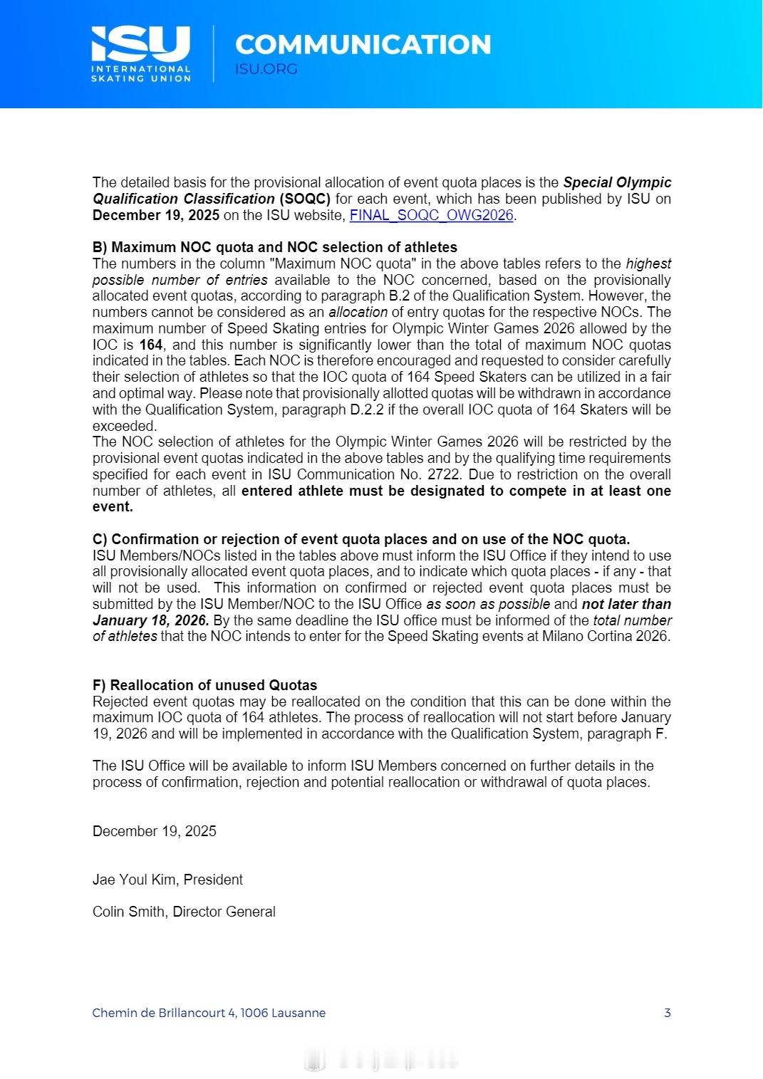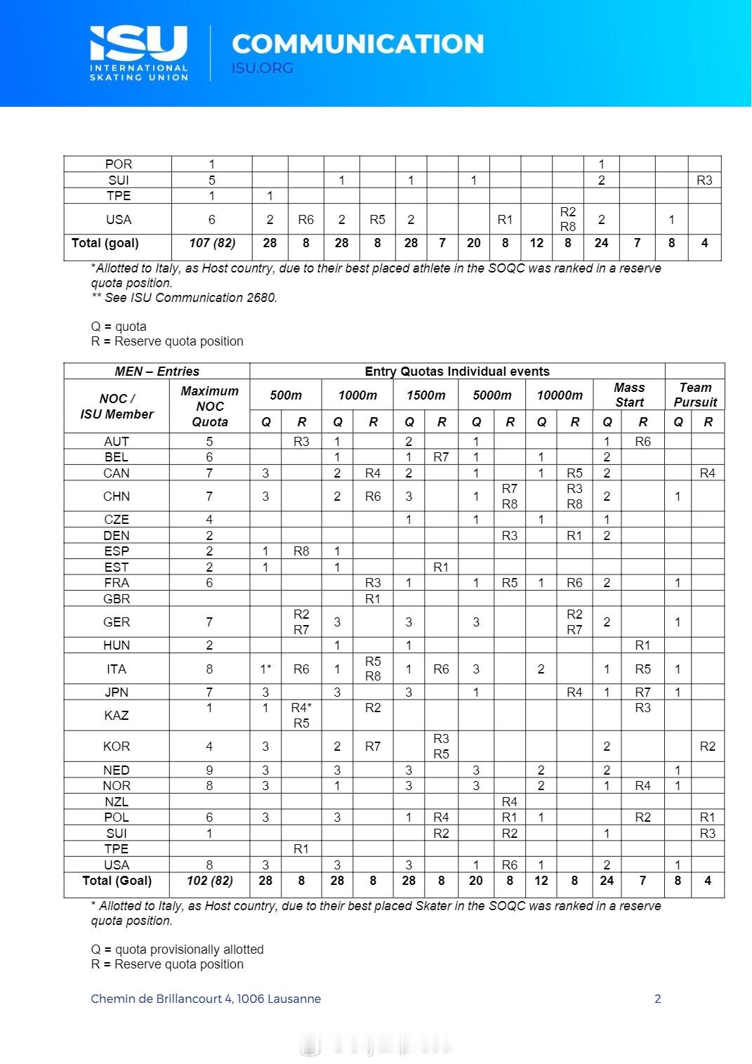 【冬奥速滑项目名额分配公布】2026米兰冬奥会 国际滑联日前公布了各协会获得的米兰冬奥会速滑项目临时分配名额,中国队共获得最多男8女7共15个名额。然而,由于这份初步分配方案名额共计209个(男107、女102),远超了冬奥会允许参赛的男女各82个共164个名额。国际滑联因此要求各协会公平有效使用配额,如果最终参赛总数超过164人,将按排名撤回临时分配的配额,优化顺序依次为女子500米、男子500米、男子1000米、女子1000米、女子1500米、男子1500米、男子集体出发和女子集体出发。
