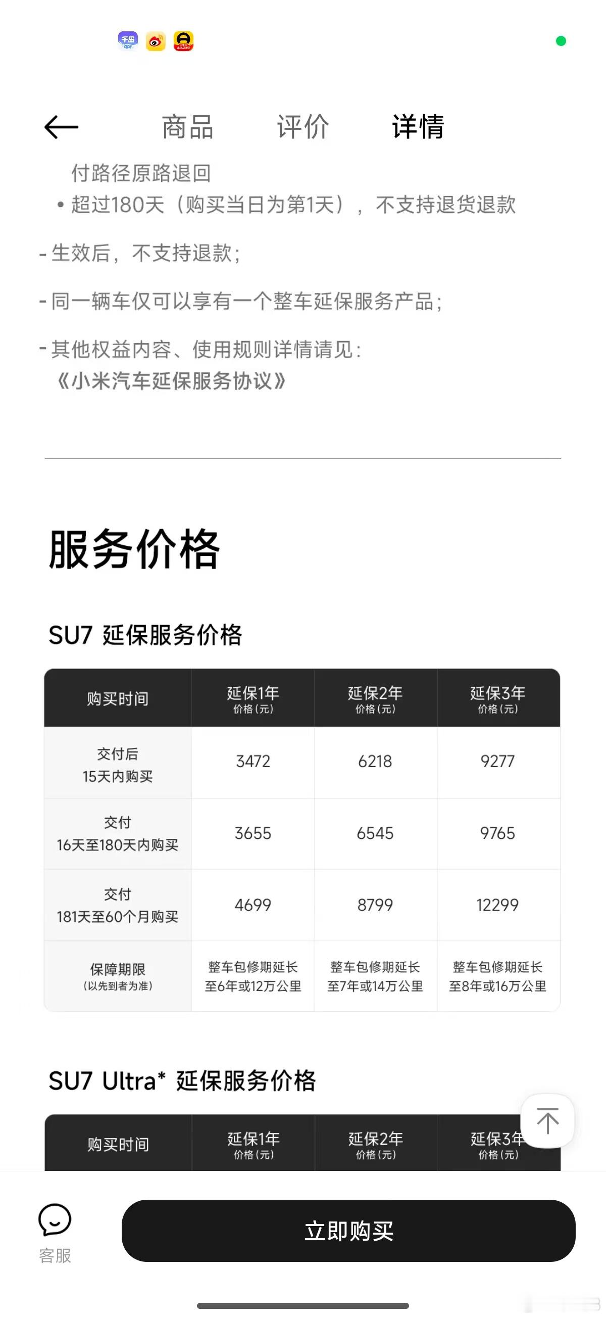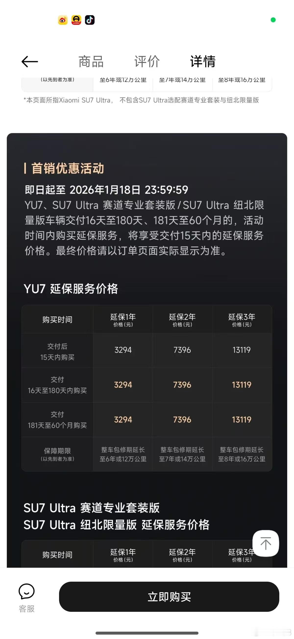 小米汽车上线了一波延保服务限时权益,1月18日结束之前,YU7、SU7 Ultra 赛道专业套装版/SU7 Ultra 纽北限量版车辆交付16~180天、181天~60个月的车主购买都可以享受交付15天内的延保服务价格。小米YU7新能源汽车