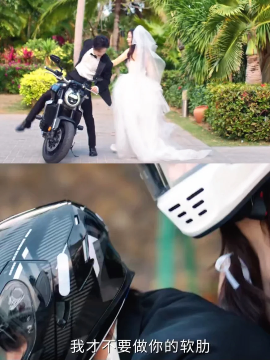 ‼️朝暮的婚礼没有伴郎伴娘的簇拥,“私奔”的浪漫伴随摩托的轰鸣将他们的誓言点燃,西装配头盔,“领航员”白纱飘扬是幸福最好的模样。