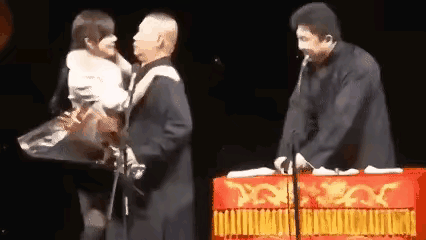 女粉丝(上台献花时突然搂住郭德纲脖子):郭大爷,让我亲一口啵,就一口。 郭德纲