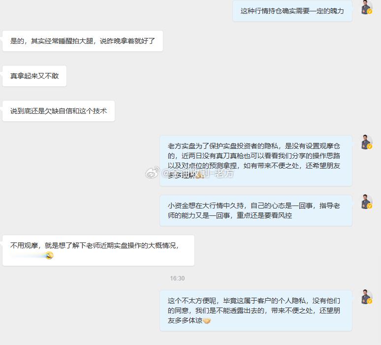 两天没分享策略,我的老朋友们都急了,马上圣诞了,过完就要跨年,看来老方最近连轴转都得分享些神策到博文上了,第一让不满足赚零花钱的兄弟,观摩考察。让只想赚零花钱的兄弟也能改善一下伙食老方实盘是很重视保护实盘客户的隐私的,所以操作记录那些,没有本人同意,我们不会发出来。大家如果不放心也可以再观察一段时间,感谢大家对老方的信任与认可,但我这个人比较实事求是,我这里没有百分百赚钱的单子,但每一单都是团队百分百认真分析的结果,谢谢大家,今天不多说,后续等我神策金价黄金金油趋势实战大师-老方