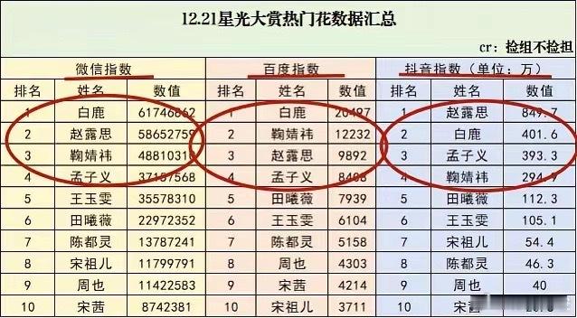 腾讯星光大赏,杨幂等几位公认的顶流都没去,本以为会冷清点,结果一看数据,好家伙,更热闹了!先说女生这边,赵露思、白鹿、鞠婧祎,这三位的数据真是“铁三角”,把其他人远远甩在后头。白鹿在微信、百度上猛,赵露思在抖音上无敌,鞠婧祎是三科都不偏科的“优等生”。紧接着就是孟子义,稳稳卡在第四。这四位,不就是最近霸屏的那几位么?白鹿《白月梵星》《临江仙》余温还在,赵露思的《许我耀眼》正热乎,鞠婧祎和孟子义的待播剧,也都是话题中心。看来,有剧在播,就是底气足啊。男生这边就更有意思了,前三甲“斗”得那叫一个激烈。王安宇和刘宇宁,简直就是“缠缠绵绵到天涯”,微信指数就差一口气,百度王安宇领先,抖音又是刘宇宁稍胜。这热度咬得死紧。反倒是第三名李昀锐,在抖音上冲得特别猛,成了一匹黑马。其实最让我意外的是,吴磊,在男星里指数这么低,是因为最近没有什么大爆剧吗?