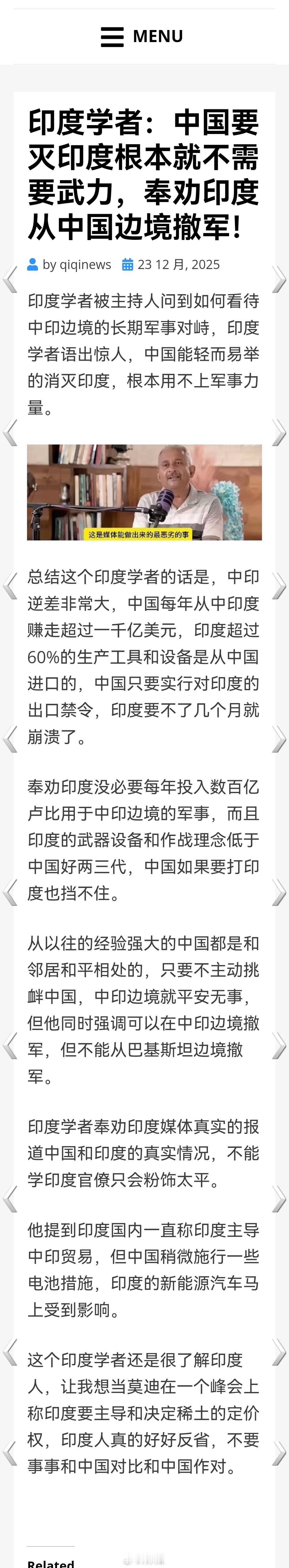 印度学者:中国要灭印度根本就不需要武力,奉劝印度从中国边境撤军! 海外新鲜事何天