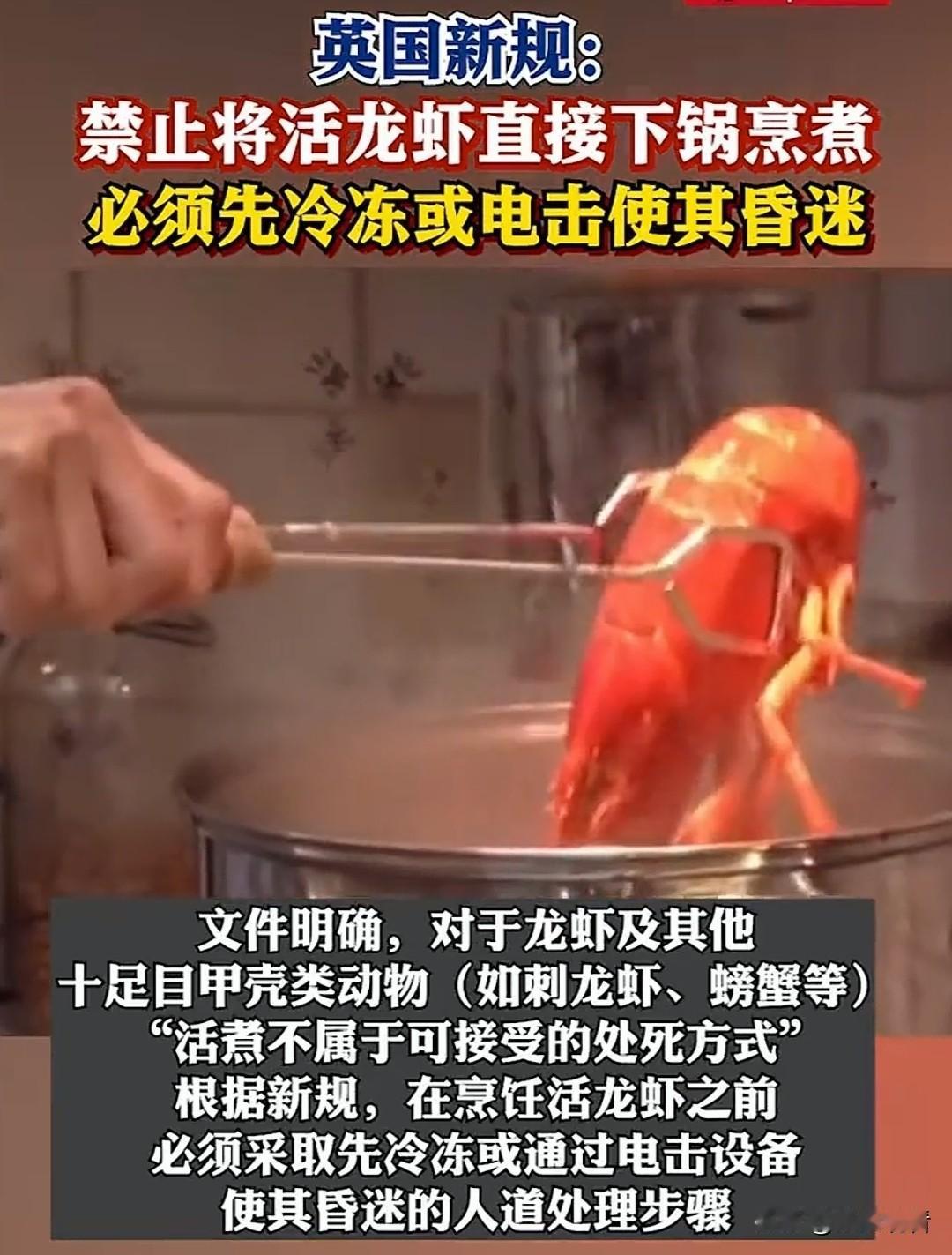 英国活煮龙虾违法!烹饪前必须先"人道处理" 活煮龙虾居然要犯法了?英国这波新规也太颠覆认知了🤯 根据官方最新战略文件,以后在英国直接把活龙虾、螃蟹扔进沸水烹煮,会被认定为违法行为!核心原因是《动物福利感知法》早已明确,这类甲壳类动物能感知疼痛——活煮时它们会挣扎好几分钟,心脏甚至能在沸水中跳动两分钟,痛苦值拉满。 想吃龙虾也不是不行,但必须先过"人道关":要么用专用电击设备瞬间致昏,要么低温冷冻麻醉,等完全没知觉了才能下锅。这波操作其实不算首创,瑞士、挪威早就有类似规定了~ 网友们吵翻了:有人夸是文明进步,也有人吐槽"选择性慈悲"😂 你觉得这波新规合理吗?