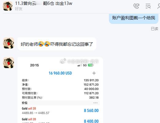 汗流浃背了???在牛市中抓抄顶行情,太刺激了兄弟们老方实盘喜讯分享 恭喜小云拿下今日开门红16960美金的收益,空头还在延续,账户资金只会越来越多,给力全市场都去追多的时候,只要老方看透了行情的诡计,这才能带领兄弟们持仓至今,拿下这份沉甸甸的炭中取栗。今天这单的利润也许不是市场最多的,但含金量一定是市场数一数二的,不信,大家去找找,有几个老师这种行情下,还敢带人逆势狙击并吃到肉的,这种行情要么不出手,出手就要见利金价黄金金油趋势实战大师-老方