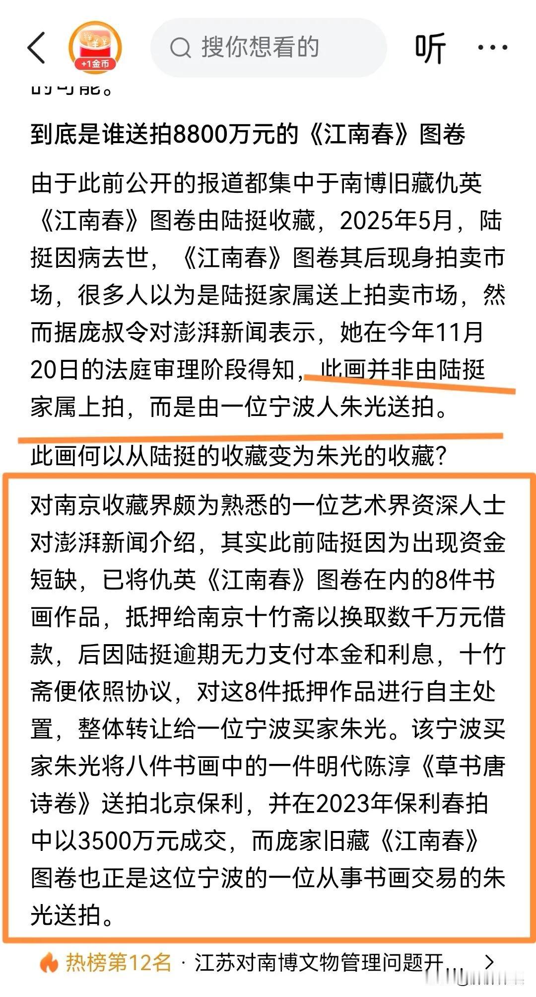 江南春事件又有新人物登场,澎湃新闻在采访庞叔令女士时,庞女士说在法院审理阶段她才得知,江南春并非由陆挺送拍。而是由一位名叫朱光的人士送拍,而这位神秘人之前至少以5000万元的价格从南京十竹斋手中获得。 查了下,十竹斋是南京一家文化投资公司,定性为国有企业,股东有南京文物公司,和之前的江苏省文物商店是两个独立体。 当时陆挺因资金短缺,把江南春在内的八幅画抵押给十竹斋。十竹斋在陆挺还不起钱后,又把画卖给朱光,而庞女士又及时阻止了江南春的拍卖。 回头来看,这幅《江南春》的“奇幻漂流”,其实早在半个多世纪前就埋下了伏笔。1959年,它作为庞莱臣家族的珍藏,被捐赠给南京博物院,南博当年的致谢信里还承诺“一定好好保存”。 谁也没想到,1961年这幅画被鉴定为“伪作”,1997年便以“拨交”名义转给了江苏省文物总店,而签字批准这一操作的南博副院长徐湖平,同时还是文物总店的法人代表。 换句话说,这波“左手倒右手”的操作,让一件捐赠文物悄悄脱离了公众监管,为后续的流转埋下了隐患。上海收藏家颜明回忆,1999年他就在陆挺家中见过此画,早于文物总店登记的2001年出售时间。 更耐人寻味的是,文物总店的销售底单上,买家一栏只写着“顾客”二字,圈内人称这是“内柜”操作,专为隐藏买家身份而设。陆挺后来将画抵押给十竹斋,不过是这幅画脱离正轨后的又一环。 十竹斋作为国企,处置抵押文物本应遵循公开流程,但5000万元的转让价格是否合理、是否经过评估,至今没有公开说法。这让人想起2015年宁波一起质押合同纠纷,抵押的文物被擅自拍卖,最终引发巨额赔偿诉讼 。 庞叔令的维权之路更是跨越了两代人。从1979年父亲追索被借走的画作,到2025年阻止《江南春》拍卖,46年里,家族捐赠的137件文物中已有5件“不知去向”。 南博方面则辩称,文物所有权自捐赠后已归属国家,捐赠人无权要求返还,但这与“妥善保管”的承诺形成了刺眼对比。争议的核心,早已不是画作真伪,而是捐赠文物的管理边界。 历史上,类似的文物纠纷并不少见。2000年保利集团花天价从海外竞拍回圆明园兽首,正是为了阻止国宝流失,而《江南春》的流转则暴露了国内文物管理的漏洞。 如今,江苏已成立联合调查组介入此事,但公众更关心的是,如何让捐赠文物的流转全程可追溯,如何避免“伪作”成为随意处置的借口。毕竟,每一件文物的背后,都连着一段历史、一份信任。 文物捐赠从来不是“一送了之”,保管方的责任更不能模糊。当“好好保存”的承诺遇上模糊不清的流转记录,受损的不仅是捐赠者的情感,更是整个文物保护体系的公信力。 最后想问大家:你觉得捐赠给博物馆的文物,该如何保障其流转透明?对于被鉴定为“伪作”的捐赠品,又该如何规范处置?欢迎在评论区留下你的看法~