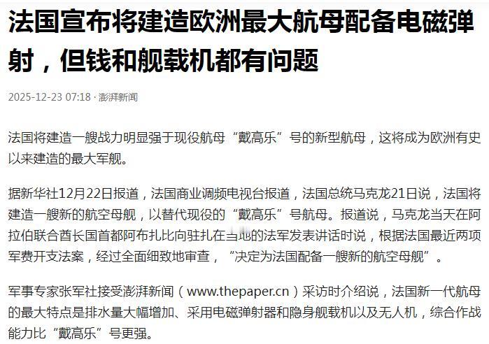 东大的003入列和004在建,对西方刺激太大了! ——首先是特朗普。当地时间12月22日,美国总统特朗普举行新闻发布会,宣布美国海军将建造两艘“特朗普级”新型战舰,这将是美军“最快、最大的战舰”,战斗力将比现有舰艇“强大百倍”。 ——其次是马克龙。当地时间12月21日,法国总统马克龙宣布法国将建造一艘新的航空母舰,以替代现役的“戴高乐”号航母。