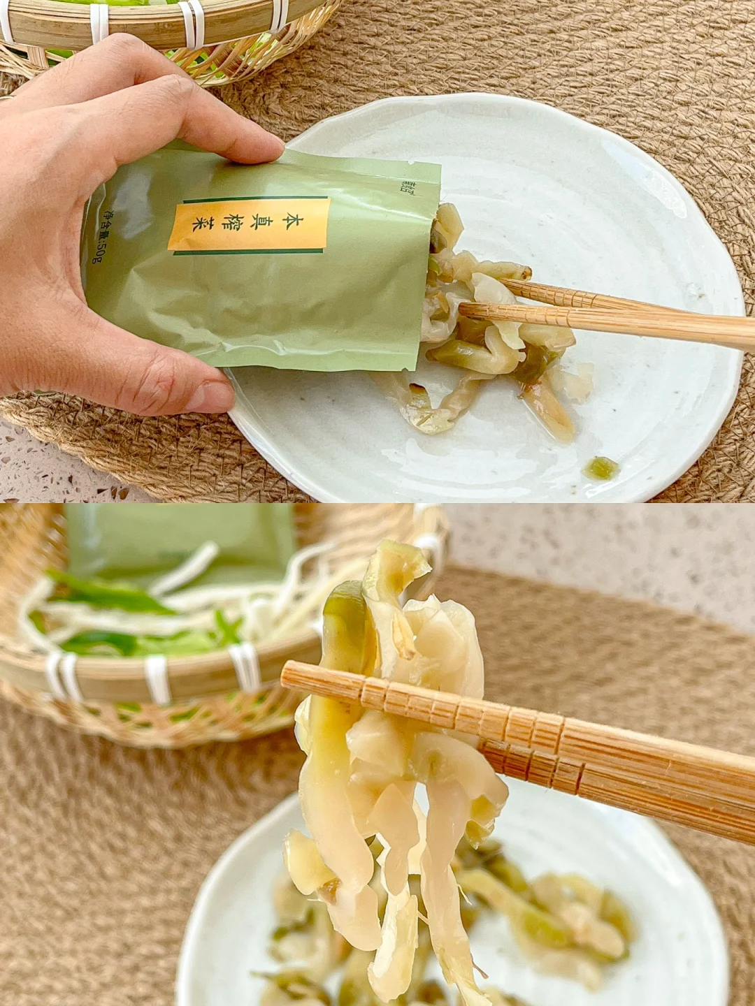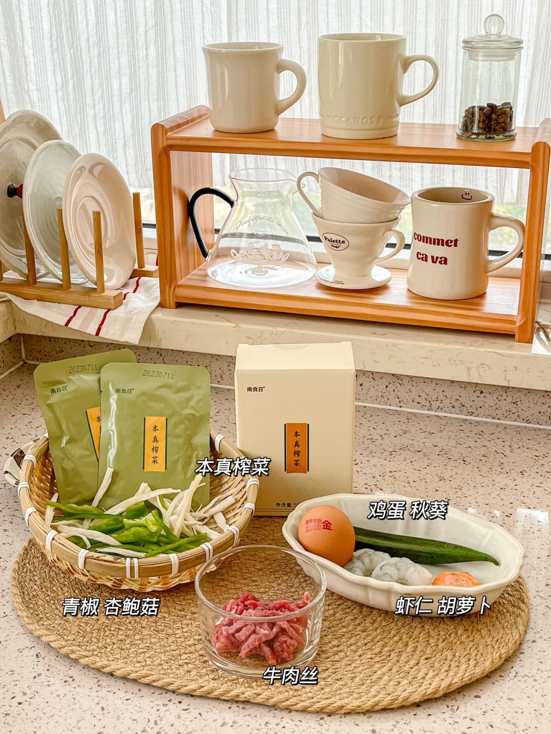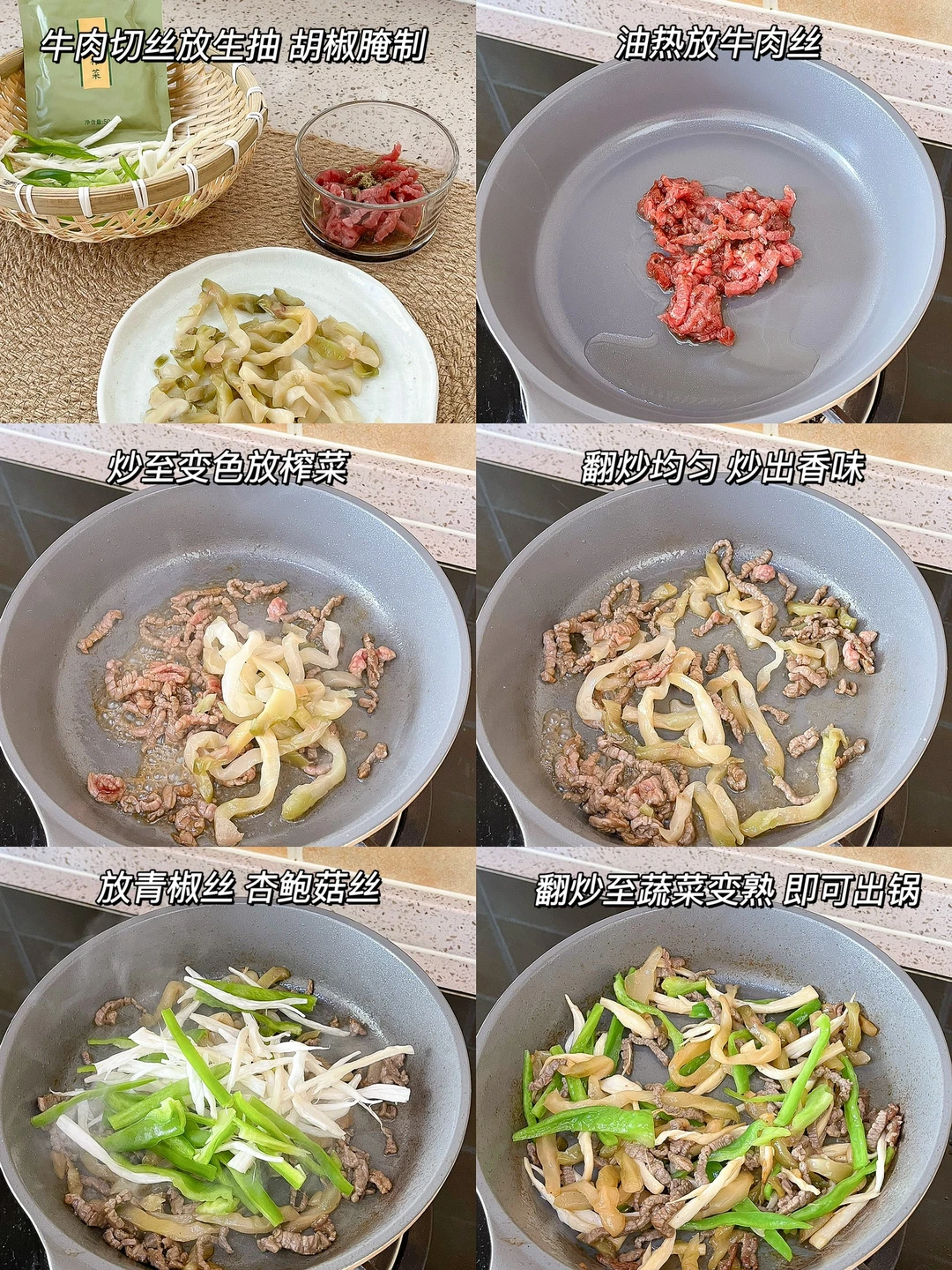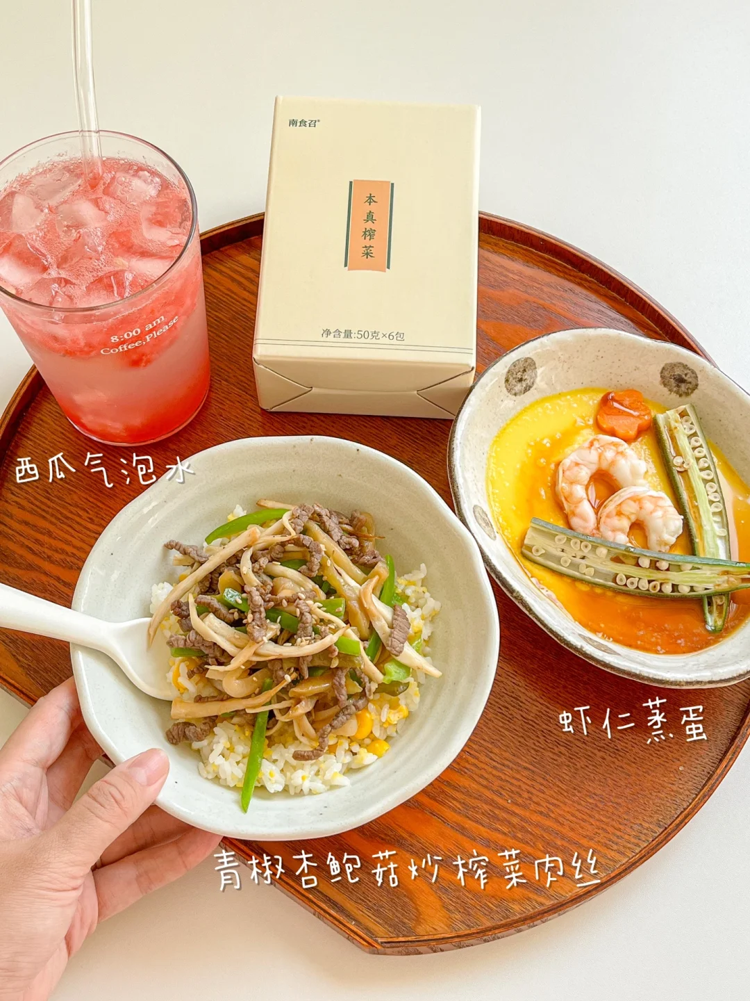青椒和杏鲍菇撕成丝再配上榨菜和牛肉清炒,很适合减脂期吃,做起来方便还低卡!加了小米辣很提味,我很喜欢南食召本真榨菜,没有用味精和很多盐,比较清淡,是自然发酵的爽脆。小包装一个人吃刚刚好~