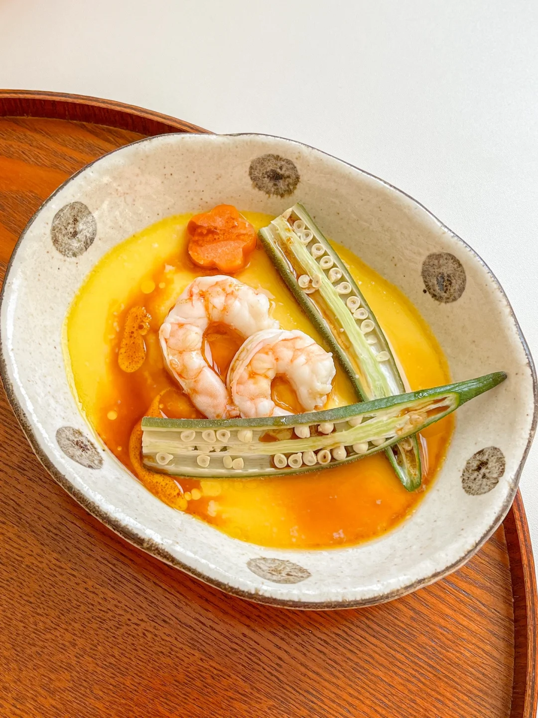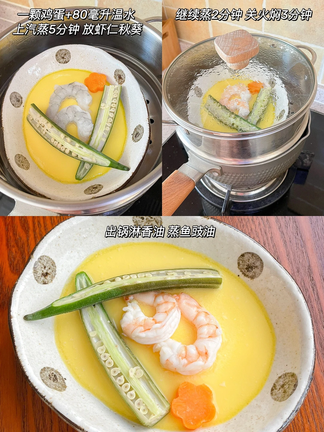 布丁蒸蛋很简单,一颗鸡蛋+80ml温水,蒸5分钟,放虾仁和秋葵丁,再蒸2分钟,关火焖3分钟就好了。又嫩又滑的蒸蛋,淋上一点蒸鱼豉油和香油就好了