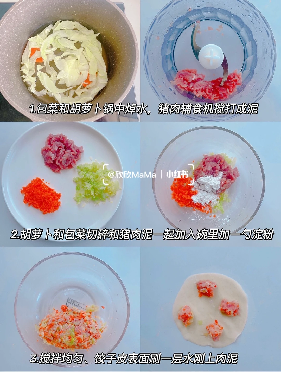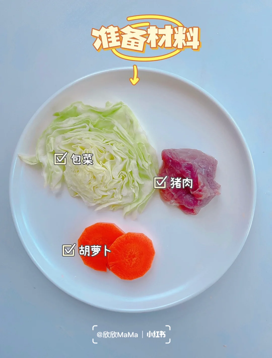 1️⃣猪肉用生姜片浸泡去腥后辅食机搅打成肉泥,包菜和胡萝卜锅中焯水后切碎