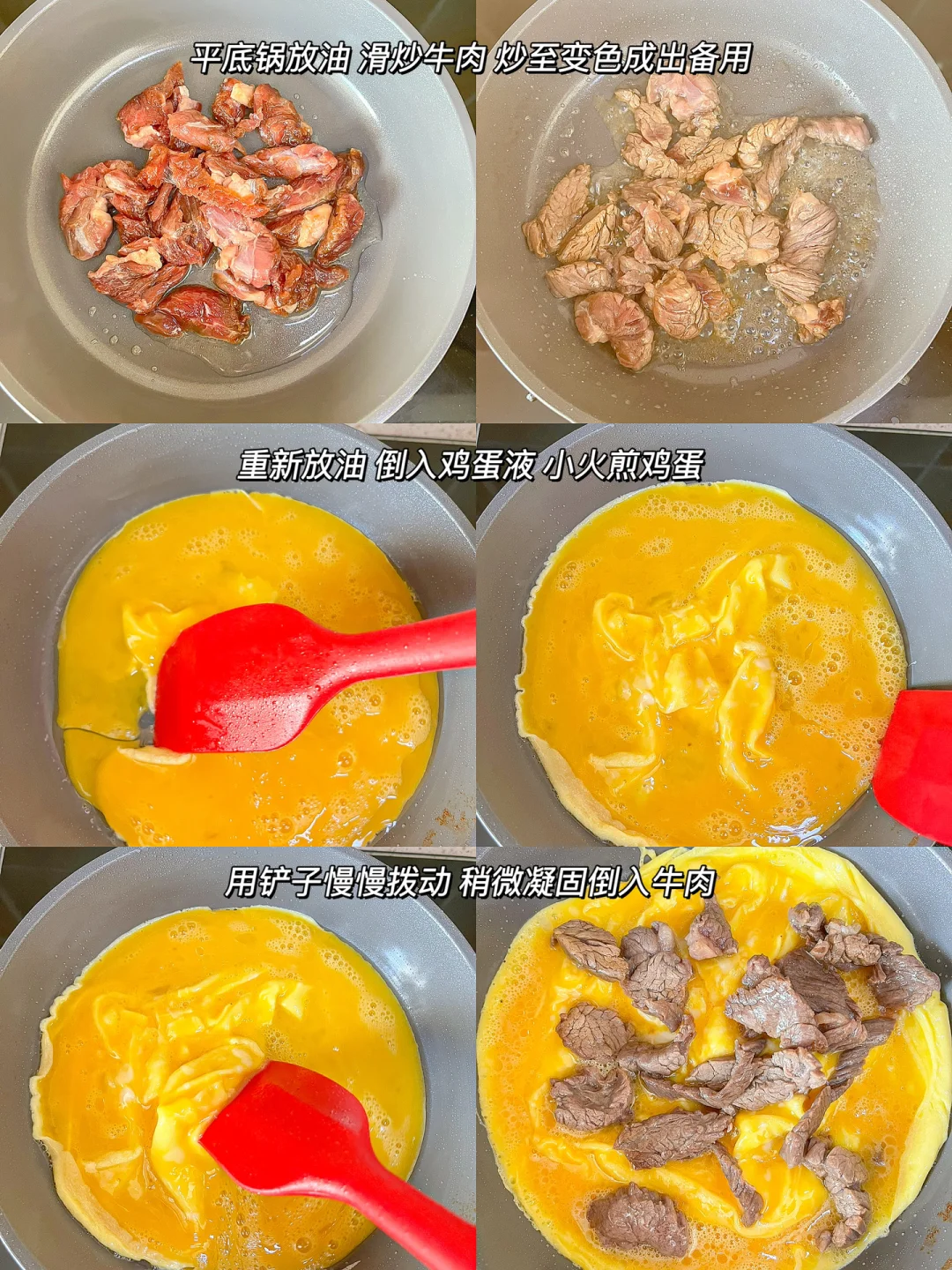 4.重新放油倒入蛋液,调小火,用铲子慢慢推鸡蛋液,稍微凝固倒入牛肉,关火
