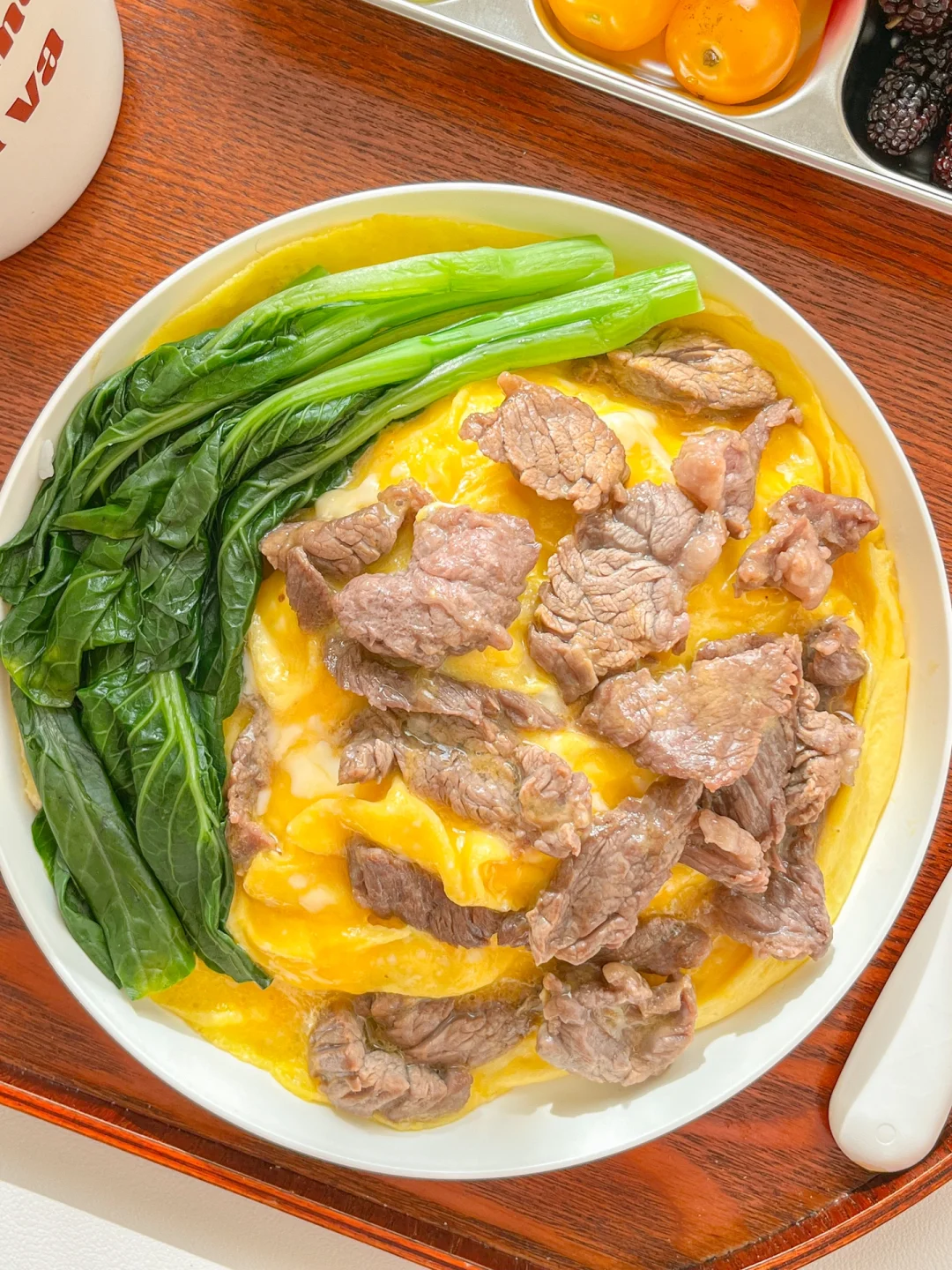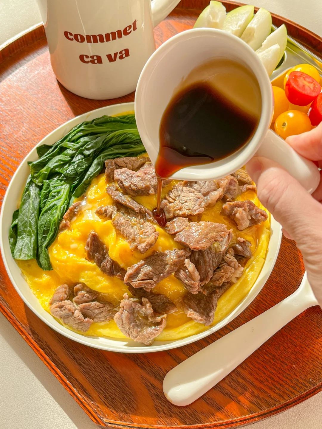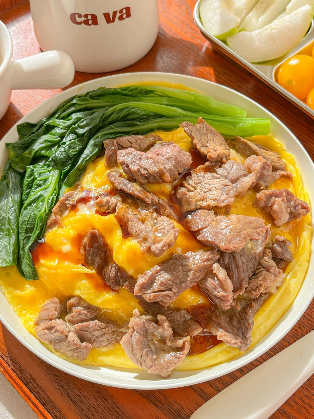 5.盘子放上藜麦饭,铺上滑蛋牛肉,放几颗焯水的菜心,淋入酱汁就可以吃了