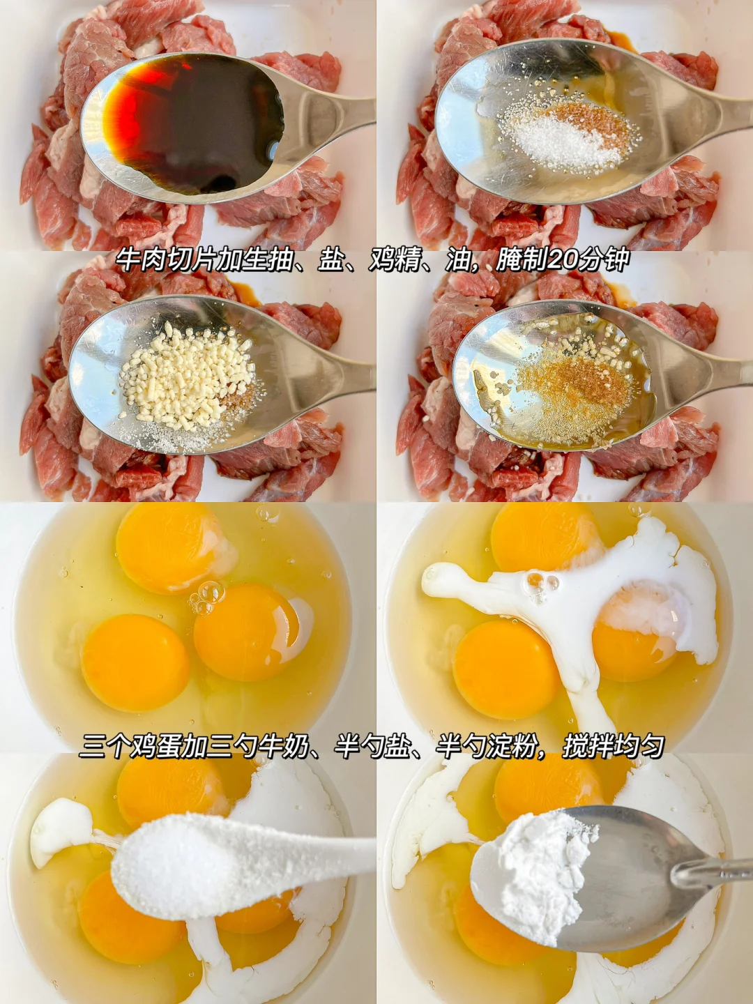 2.三个鸡蛋加三勺牛奶、半勺盐、半勺淀粉