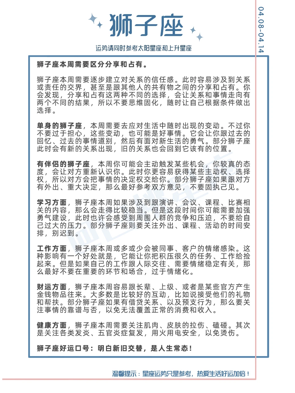 下周重点星象: 4.8周一:白羊座日食 4.9周二:白羊座新月 4.11周四:火土合 4.12周五:日水合 快来带着你的好运口号领取新一周好运吧[派对R]