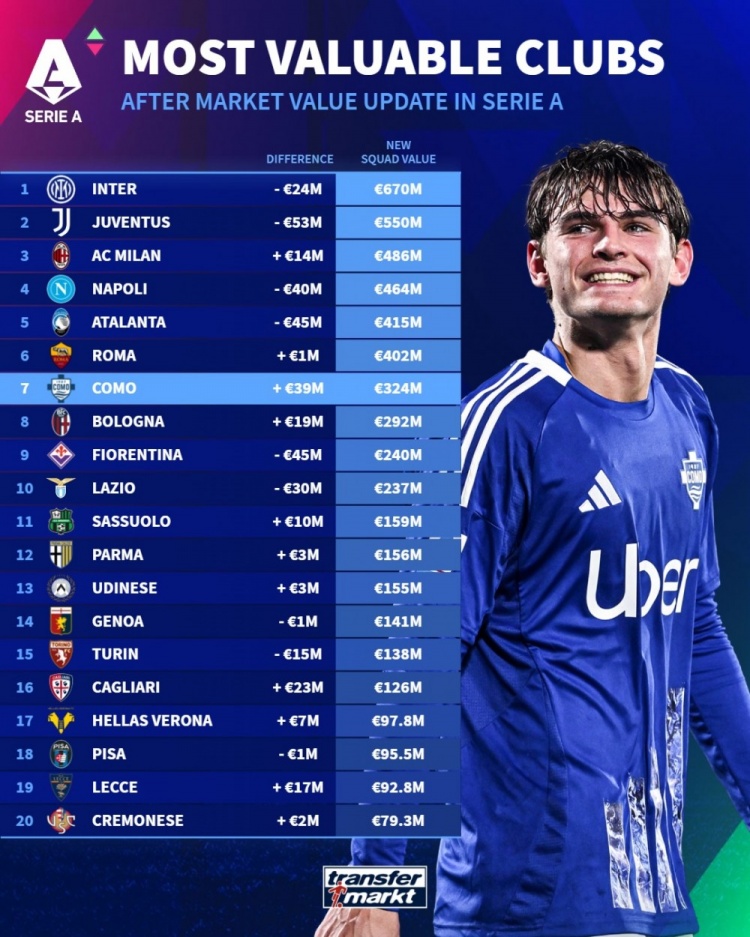 直播吧12月24日讯德国转会市场列出了意甲球队身价排名,国米、尤文、米兰前三。
