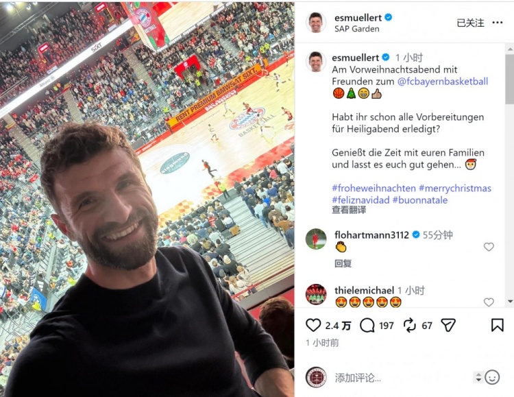 穆勒社媒晒出观赛照片,配文:“圣诞节前夕与朋友们一起观看拜仁男篮的比赛各位都为圣诞夜做好准备了吗?好好享受与家人共度的美好时光,祝大家一切安好。”