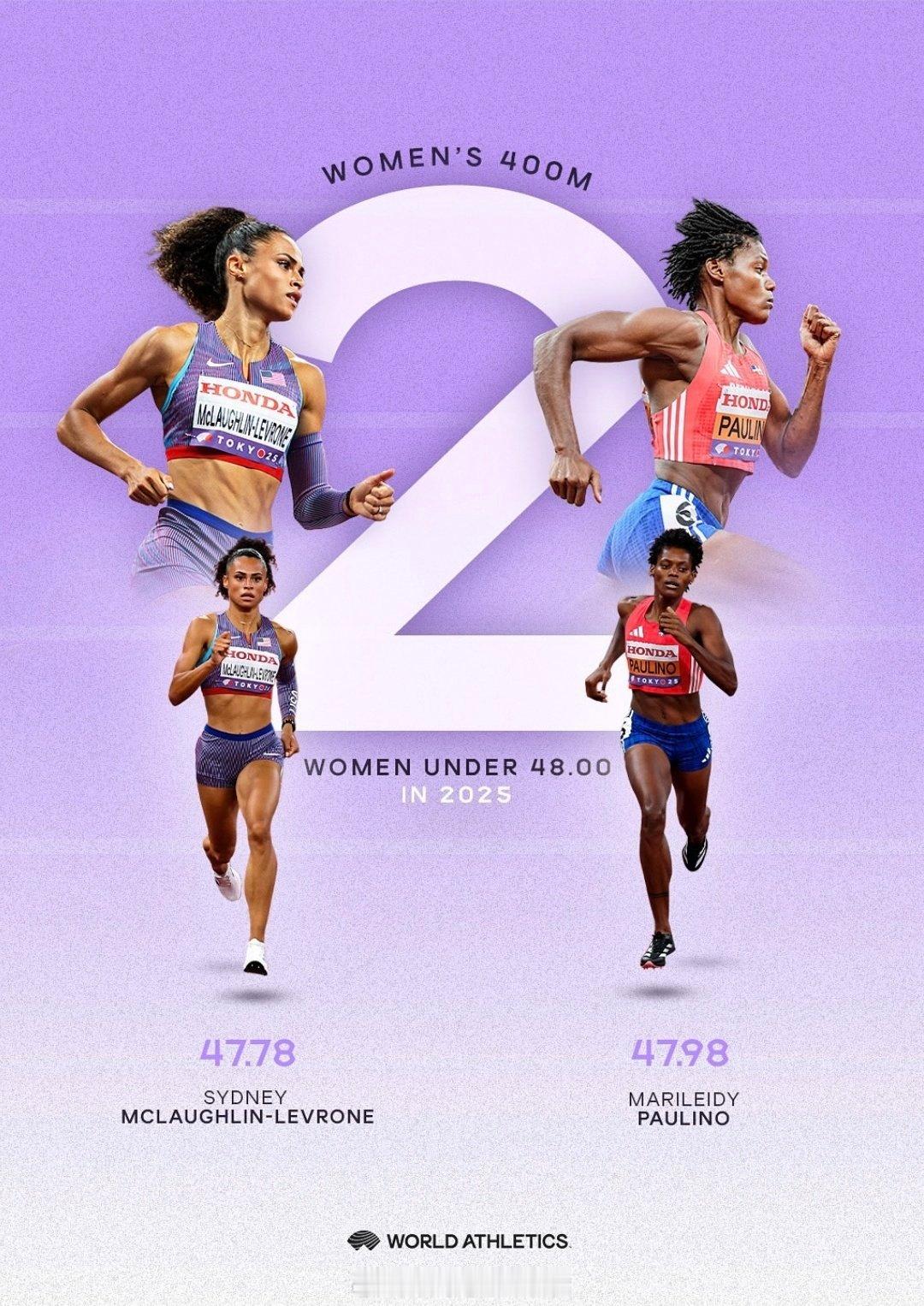 2025年度女子400米,🇺🇸麦克劳克林、🇵🇦保利诺、🇧🇭纳赛尔3人10次跑进49秒,这三人也拿下东京世锦赛前三,并且两人打开48秒,创历史的一年!田径说一哈田径你不知道的田径故事
