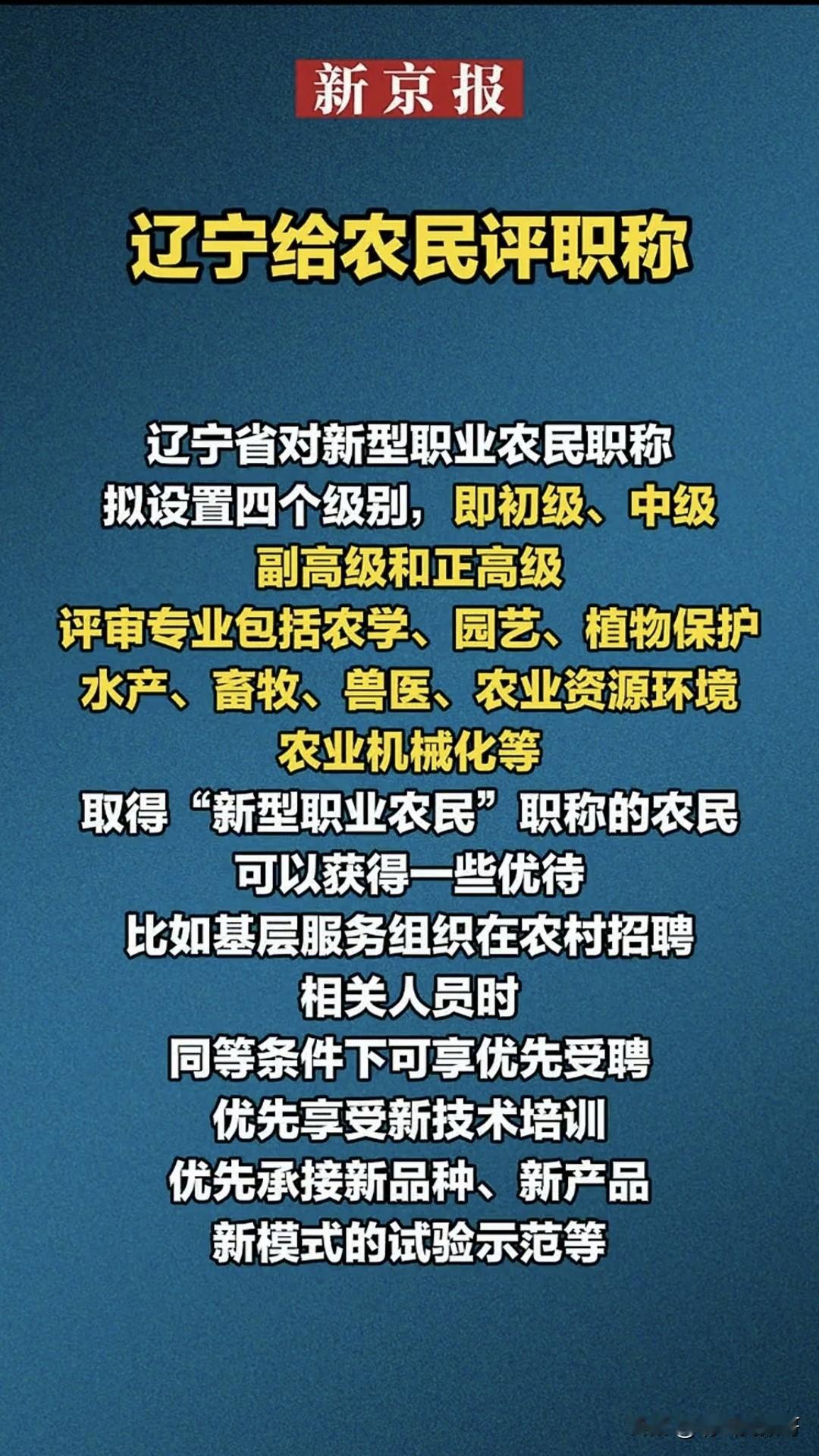 辽宁也计划给农民评职称了 说起这事,其实山东、河南等地早有推行,辽宁作为农业大省现在也跟上了。这次职称拟设四个级别,评审专业涵盖农学、园艺等多个领域。新型职业农民得在农业农村一线,有技术技能还能起示范带头作用。评上职称好处不少,招聘优先受聘,还能优先培训和承接试验示范。这有利于提高农民职业归属感,稳定人才队伍,为乡村振兴注入新活力。 只是这职称评审很上去了,对应职称的管理工作是不是也会跟上呢?包括如何防止评审过程出现违规也是需要注意的。