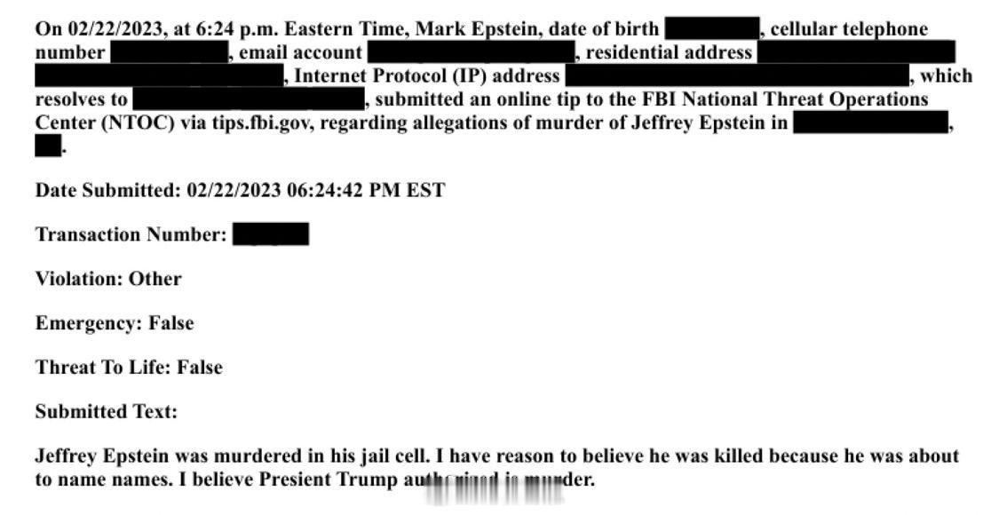 爆炸新闻:最新爱泼斯坦案文件曝光:杰弗里·爱泼斯坦的兄弟马克向联邦调查局透露,他的哥哥是被谋杀的,而且是特朗普批准授意的。海外新鲜事何天恩