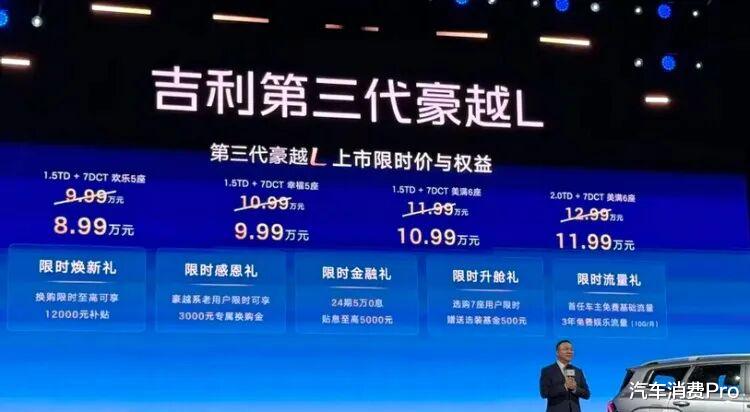 吉利豪越L大空间+低价格所呈现的高性价比一直深受消费者喜爱,如今这台车迎来换新。11月27日,第三代吉利豪越L正式上市,新车推出4款车型,售价9.99-12.99万元,上市限时价8.99-11.99万元。