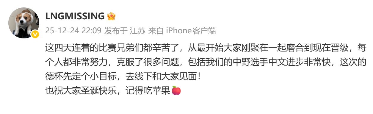 虎扑12月24日讯LNG成功晋级2025德玛西亚杯淘汰赛,MISSING赛后发文: