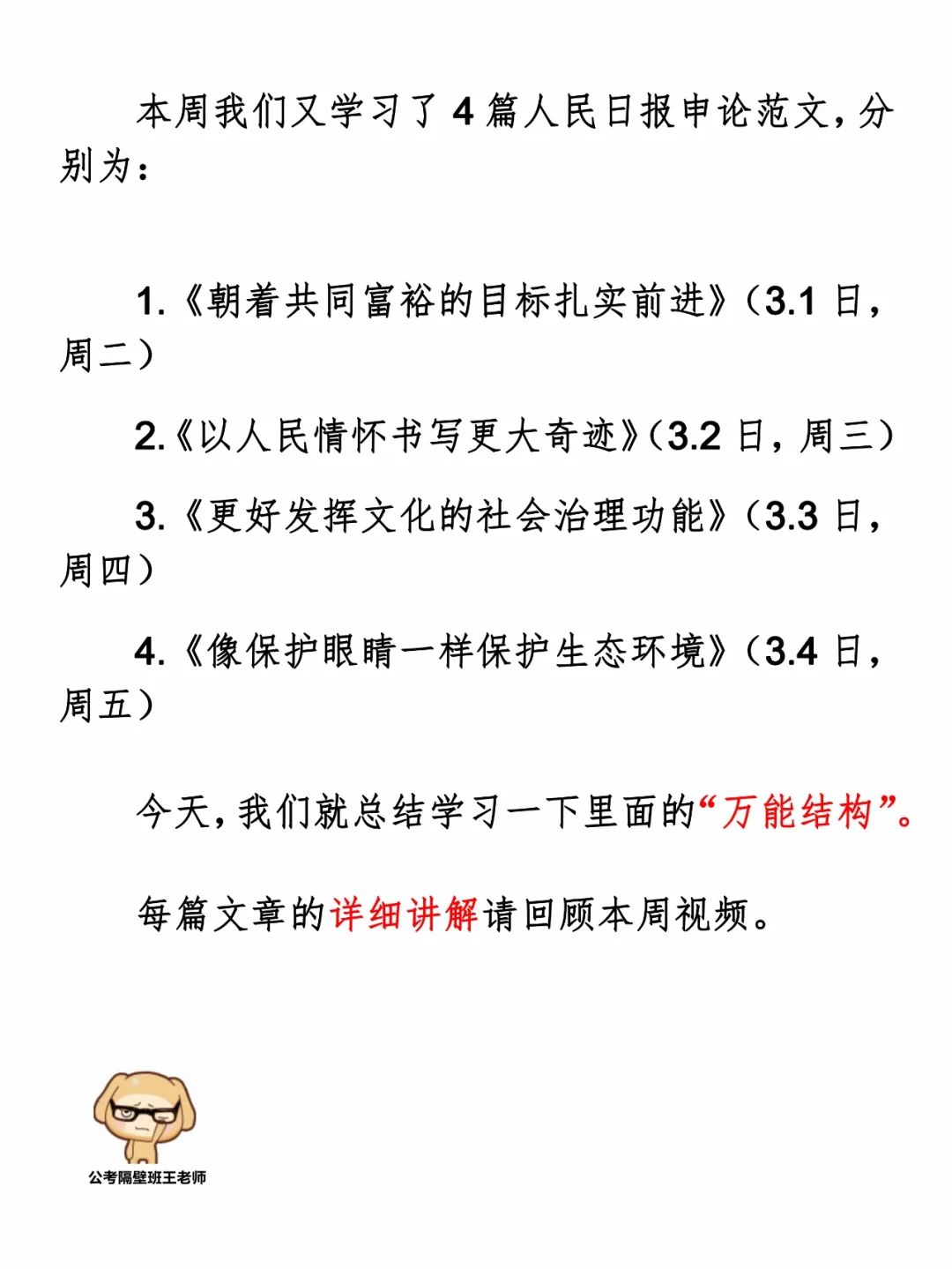本周我们又学习了4篇人民日报申论范文,分别为: 1.《朝着共同富裕的目标扎实前进》(3.1日,周二) 2.《以人民情怀书写更大奇迹》(3.2日,周三) 3.《更好发挥文化的社会治理功能》(3.3日,周四) 4.《像保护眼睛一样保护生态环境》(3.4日,周五) 今天,我们就总结学习一下里面的“万能结构”。 每篇文章的详细讲解请回顾本周视频。 ⭐️ ⭐️ ⭐️ ⭐️ ⭐️ 这里是公老隔壁班王老师独创的“每天半小时 申论80分”抄写团,欢迎加入我们!