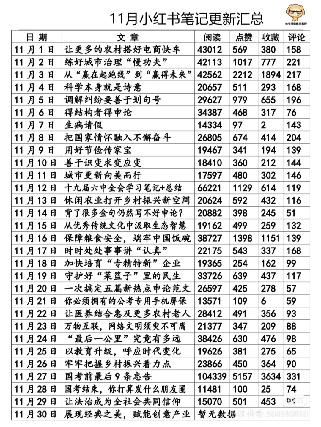 今天是11月的最后一天,也是我在坚持分享的第100天。我简单梳理和回顾了11月的申论范文和分析(见图3),有几个点值得关注: