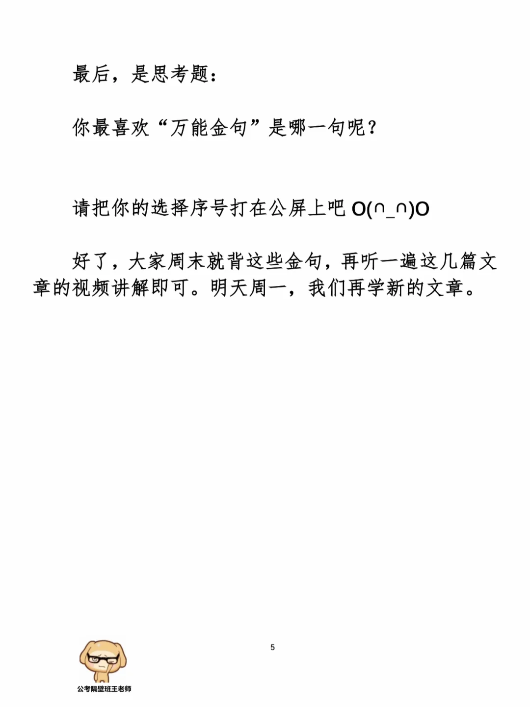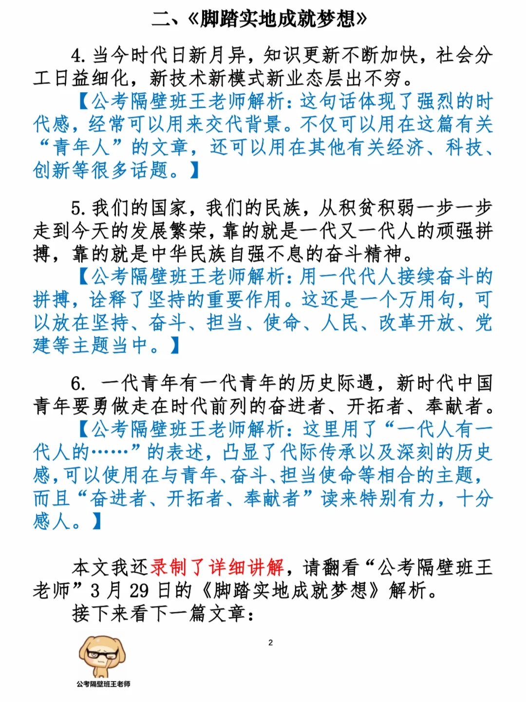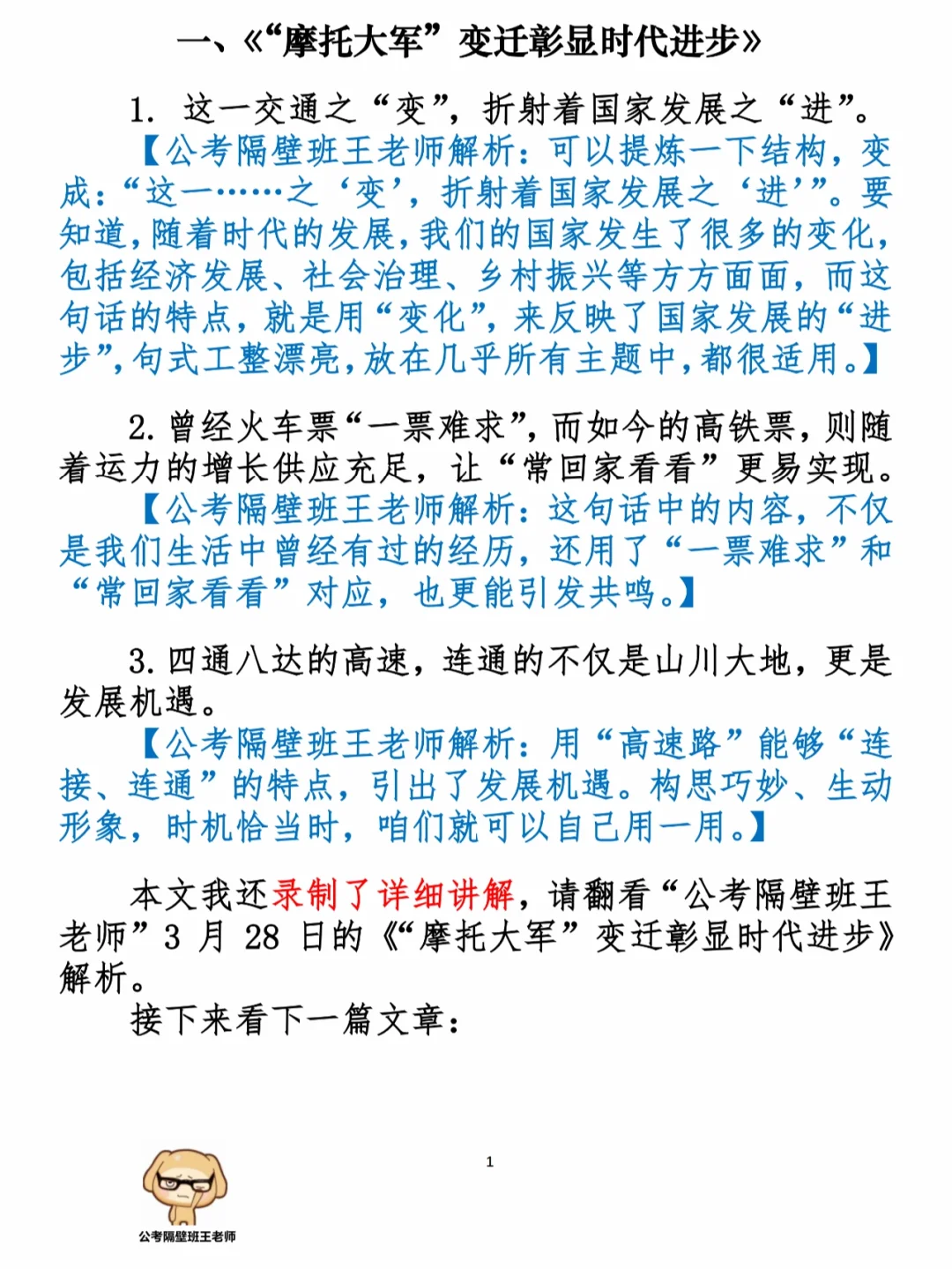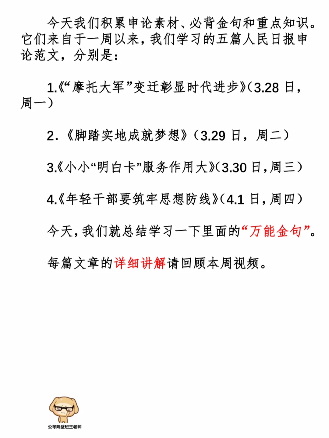 今天我们积累申论素材、必背金句和重点知识。它们来自于一周以来,我们学习的四篇人民日报申论范文,分别是: 1.《“摩托大军”变迁彰显时代进步》(3.28日,周一) 2.《脚踏实地成就梦想》(3.29日,周二) 3.《小小“明白卡”服务作用大》(3.30日,周三) 4.《年轻干部要筑牢思想防线》(4.1日,周四) 每篇文章的详细讲解请回顾本周视频。 ⭐️ ⭐️ ⭐️ ⭐️ ⭐️ 这里是公考隔壁班王老师独创的“每天半小时 申论80分”抄写团,欢迎加入我们!