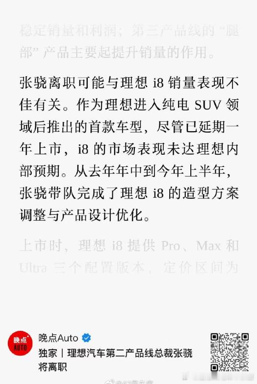 晚点Auto爆料,理想汽车第二产品线的负责人 张骁将于近期离职理想汽车