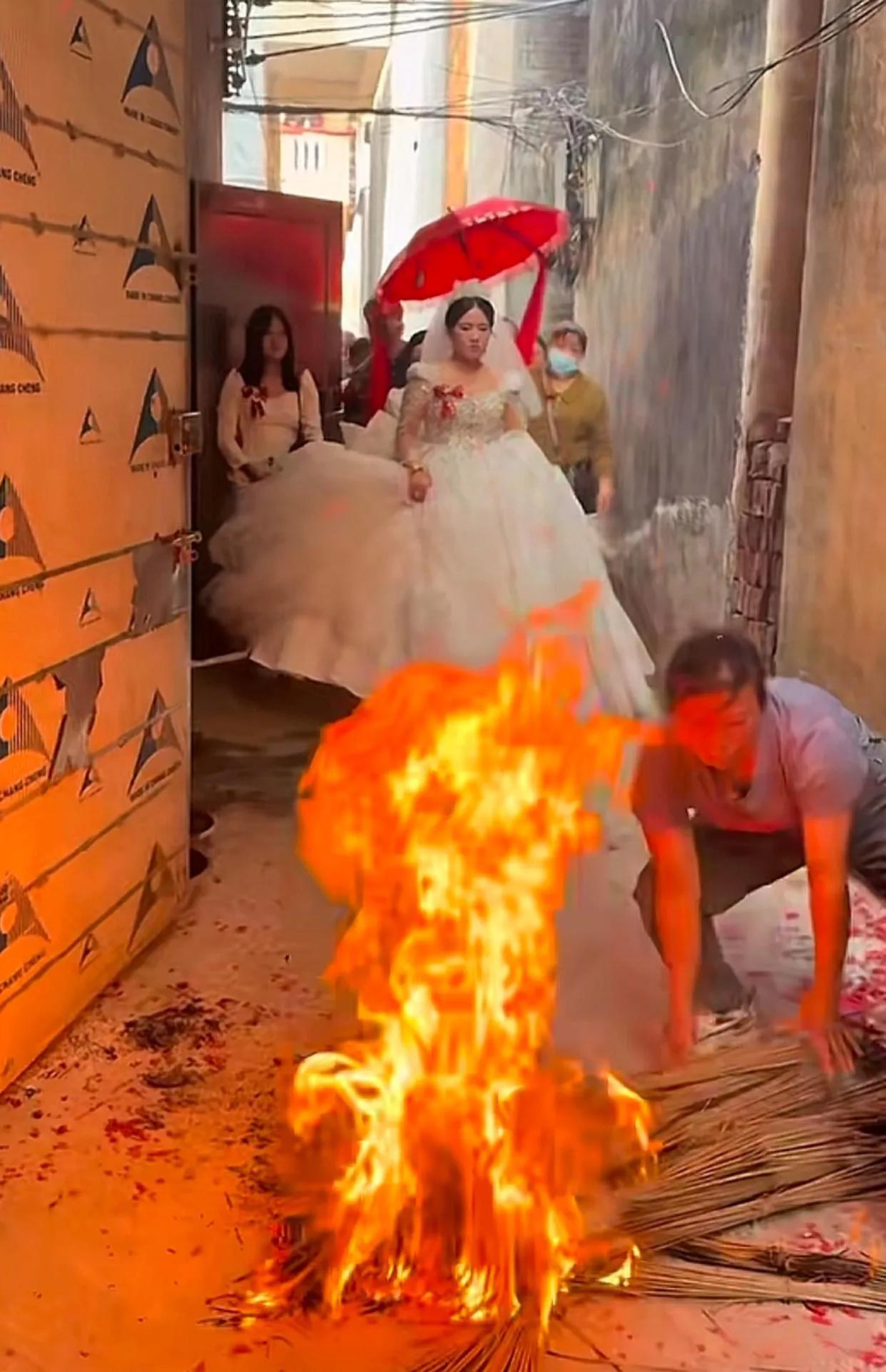 新娘跳火盆是中国传统婚礼习俗,寓意是驱邪避灾、祈求婚后生活红红火火、人丁兴旺。不过这位大姐整这火也太大了吧!让人家咋跳啊?