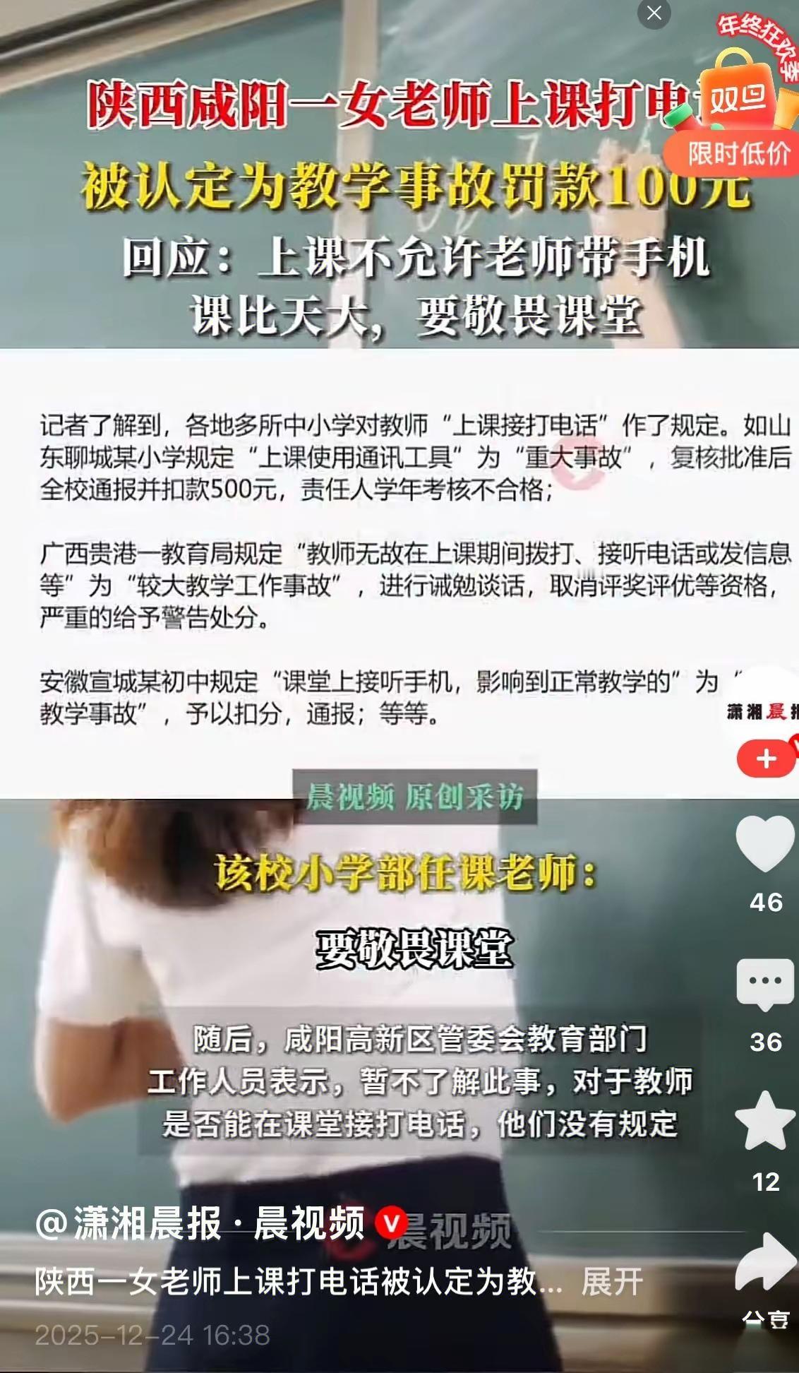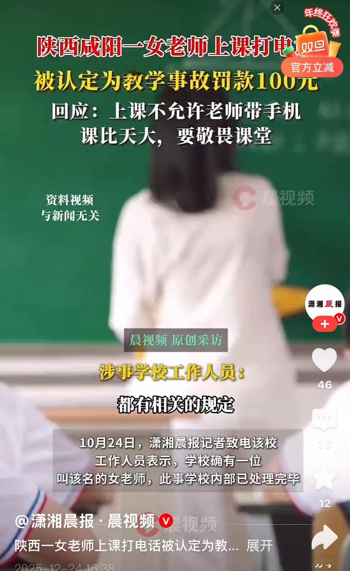 咸阳一女教师上课打电话,被认定教学事故,并被罚款100元在全校通报! 像这样的