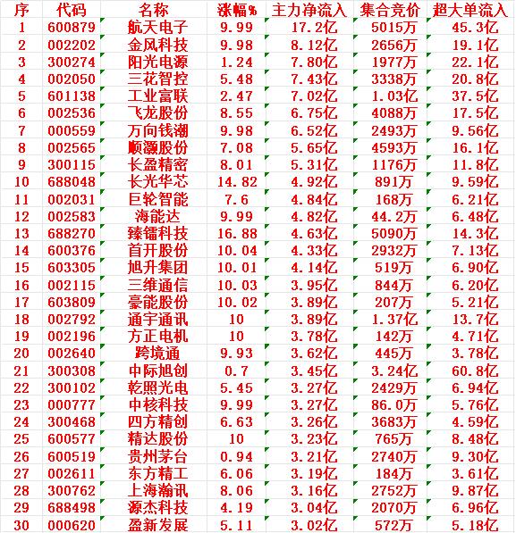 12月25日收盘,主力资金,已经大幅卖出的30名单: 胜宏科技:净流入 -16.9 亿元 海南发展:净流入 -10.1 亿元 天孚通信:净流入 -8.46 亿元 新易盛:净流入 -8.13 亿元 航天发展:净流入 -7.57 亿元 赛微电子:净流入 -6.89 亿元 东百集团:净流入 -6.47 亿元 永辉超市:净流入 -6.43 亿元 中科曙光:净流入 -6.18 亿元 英维克:净流入 -5.95 亿元 华友钴业:净流入 -5.64 亿元 中国中免:净流入 -5.53 亿元 12月25日收盘,主力资金“大幅买入”的30名单: 航天电子:涨幅 9.99%(涨停),净流入 17.2 亿元 金风科技:涨幅 9.98%(涨停),净流入 8.12 亿元 阳光电源:涨幅 1.24%,净流入 7.80 亿元 三花智控:涨幅 5.48%,净流入 7.43 亿元 工业富联:涨幅 2.47%,净流入 7.02 亿元 飞龙股份:涨幅 8.55%,净流入 6.75 亿元 万向钱潮:涨幅 9.98%(涨停),净流入 6.52 亿元 顺灏股份:涨幅 7.08%,净流入 5.65 亿元 长盈精密:涨幅 8.01%,净流入 5.31 亿元 长光华芯:涨幅 14.82%,净流入 4.92 亿元 巨轮智能:涨幅 7.60%,净流入 4.84 亿元 海能达:涨幅 9.99%(涨停),净流入 4.82 亿元 臻镭科技:涨幅 16.88%,净流入 4.63 亿元 首开股份:涨幅 10.04%(涨停),净流入 4.33 亿元 旭升集团:涨幅 10.01%(涨停),净流入 4.14 亿元 三维通信:涨幅 10.03%(涨停),净流入 3.95 亿元