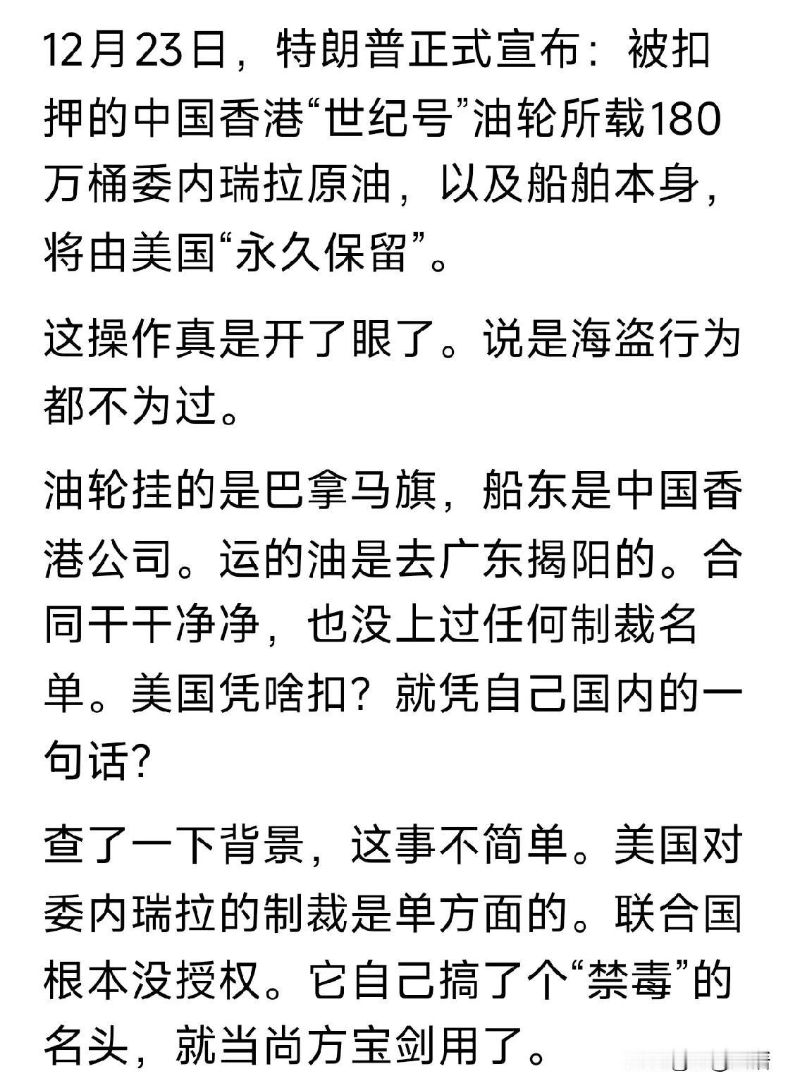 加勒比海盗重生记。 在加勒比海前往大西洋方向,一艘油轮正加大油门冲向深海,同时不断的用公开频段向外求救,他们这样的行动已经执续了三天,但至今未有救援船到来。与此同时,几艘挂着海岸警卫队牌子巡逻船正在狂追,三天狂追近千公里,他们多次试图登舰,但均被体型巨大的油轮摆脱。 加勒比海地处南北美洲之间,尤如内海,因而成为航运咽喉,是通往非到洲欧洲的关健通道,殖民时期里,英法西等在南北美洲削刮的金银庶糖等均在此集散运往欧洲,从非洲运来的黑奴也在这里上的岸。 大量财富的聚散,滋生了超大规模的海盗,这可不是电影里的打怪海盗,他们有大船,有大炮,甚至还有国家,他们以海岛为掩护,抢掠财富,一船可达百万英镑,人均可分2000-4000英镑,远大于当时年收入20英镑的水手。 1720年后,欧洲列强联手清剿,开展了如拿骚行动、洛佩斯角等多场海战,随后海军也执行了常态化巡逻,并且将私掠授权收紧、殖民地治理强化,这一波海盗才逐步终结。 然而,21世纪二十年代中期,海盗重生,这一次,他们规模更大,一个航母舰队,一个两栖舰队,他们以国家为后盾,以舰载机为矛,抢劫的是巨型油轮。 他们开始小打小闹,抢的只是四艘渔船,他们说是贩毒船,抢劫手段极其恶劣,直接击沉,毒品一克未见,反造成17人死亡。但小打小闹太不争钱了,毕竟这两个舰队的日开支上千万美元,12月10日,一群海盗身着海岸警卫队、海军陆战队、特种部队军服饰,搭乘两直升机抢下25万吨的“斯基珀号”油轮,12月20日,这群海盗又在巴巴多斯以东公海再一次抢劫了巴拿马籍“世纪号”(Centuries)油轮,这是一艘载约180万桶委内瑞拉原油,也是这伙海盗10天内抢劫的第二艘,价值约1.5亿美元,连抢两艘,这群海偿到了甜头,二天后,他们再次出动,这就发生了文章开头的一幕。 海盗日益泛滥,各国则面面相觑,海盗太强大了,大伙比的只是声音,没有实质性行动,欧洲国家甚至连谴责的声音都没有,如此姑息养奸,日后必将成大患。