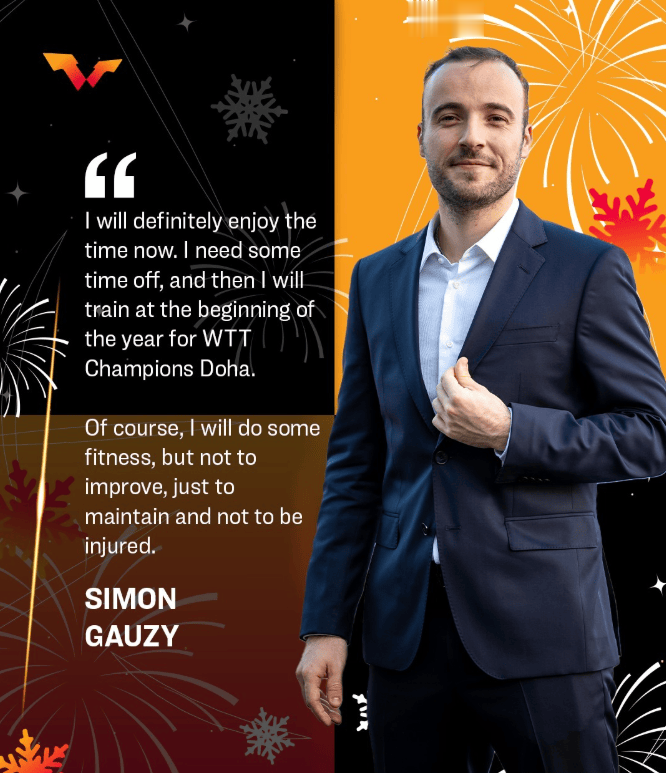 西蒙高茨:我现在肯定要好好享受这段时光。我需要一些休息时间,然后在年初为多哈世界乒乓球职业大联盟冠军赛进行训练。当然,我会做一些体能训练,但不是为了提升水平,只是为了保持状态、避免受伤。
