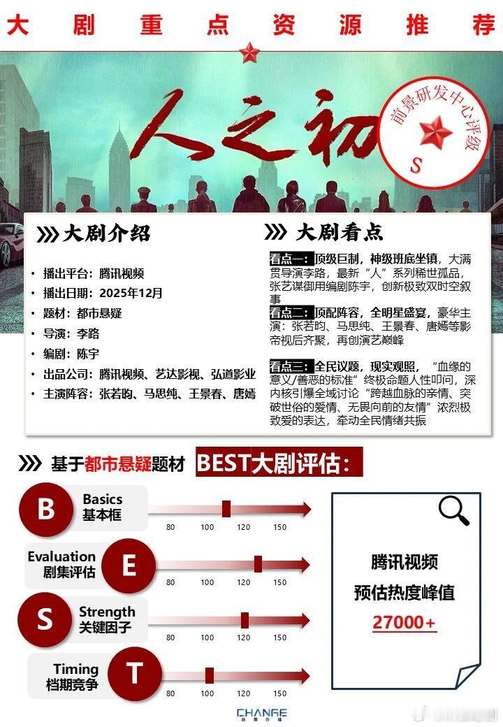 张若昀、马思纯、王景春主演,唐嫣客串的悬情剧《人之初》即将开播了,业内招商前做了基本盘评估:《人之初》S级评级,今年悬疑赛道集均排名TOP3,预计腾讯视频站内热度峰值突破27000。坐等审判!!!!