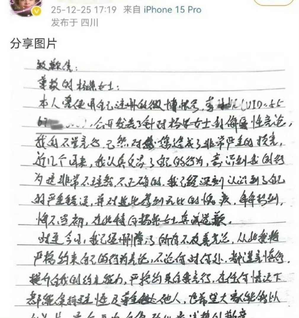 杨紫黑粉手写致歉信道歉杨紫黑粉手写致歉信
