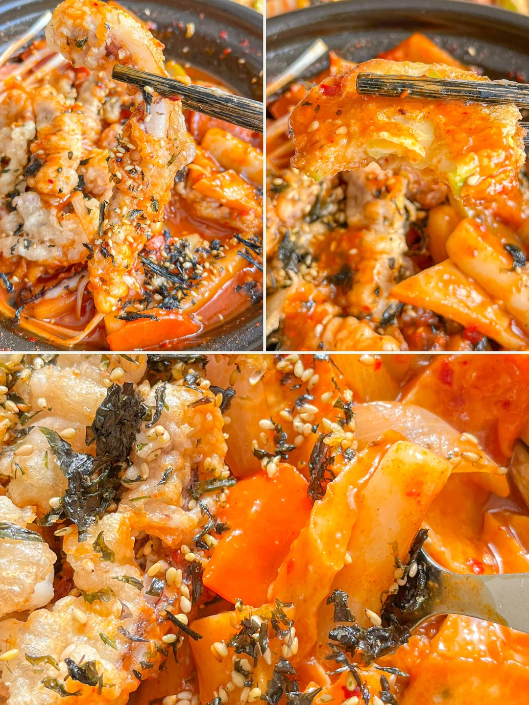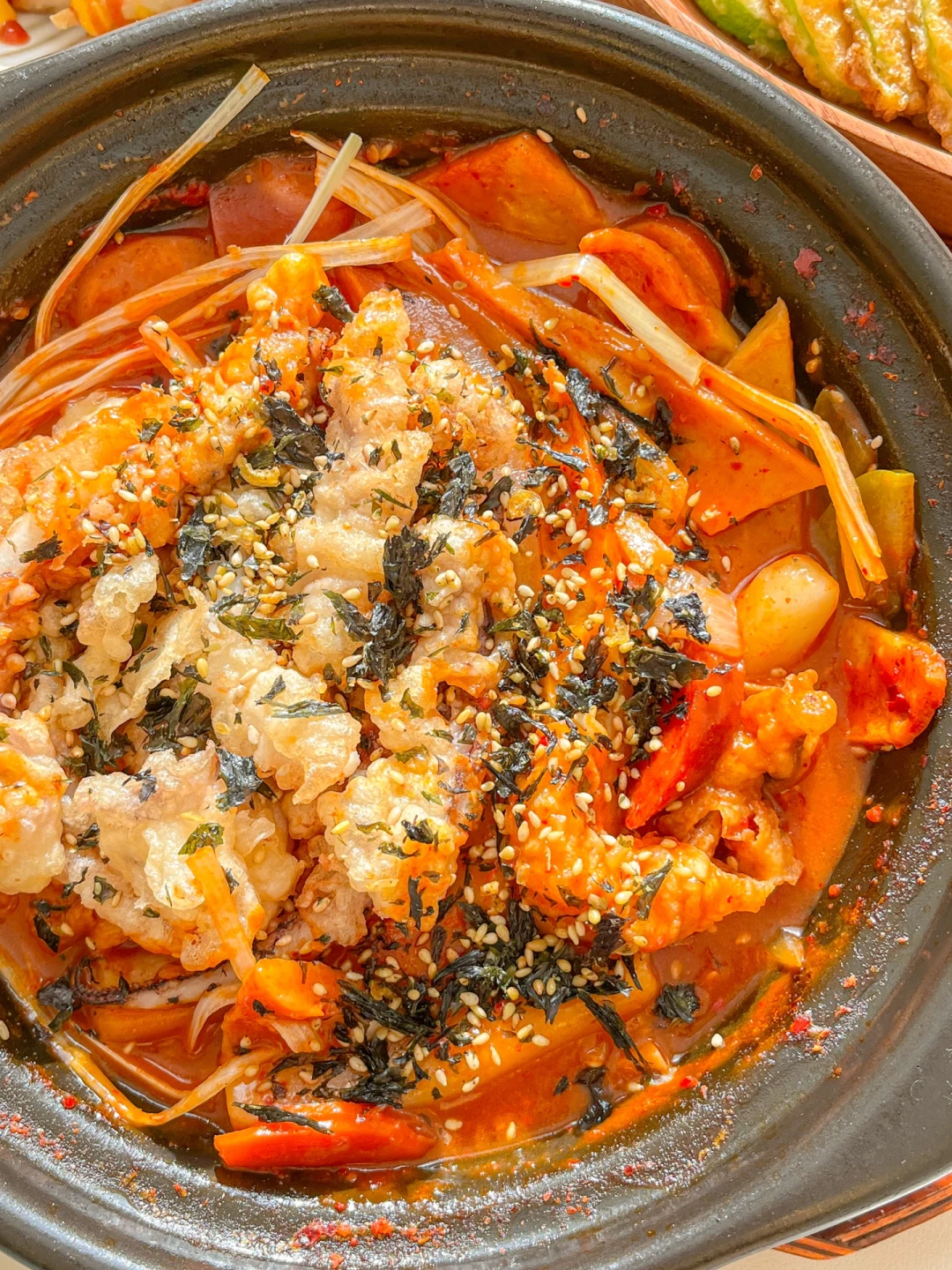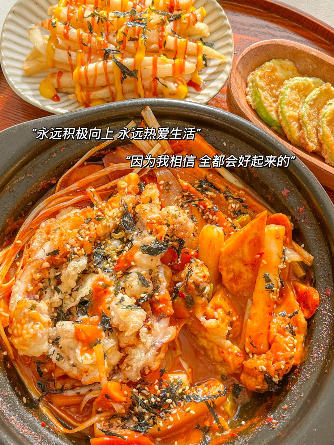 里面放了蔬菜、鱼饼和香肠,年糕软趴趴的,炸鱿鱼单吃酥脆,煮在汤锅里浸满了汤汁,入味了特别好吃。喜欢芝士的可以在出锅前扑上满满一层。