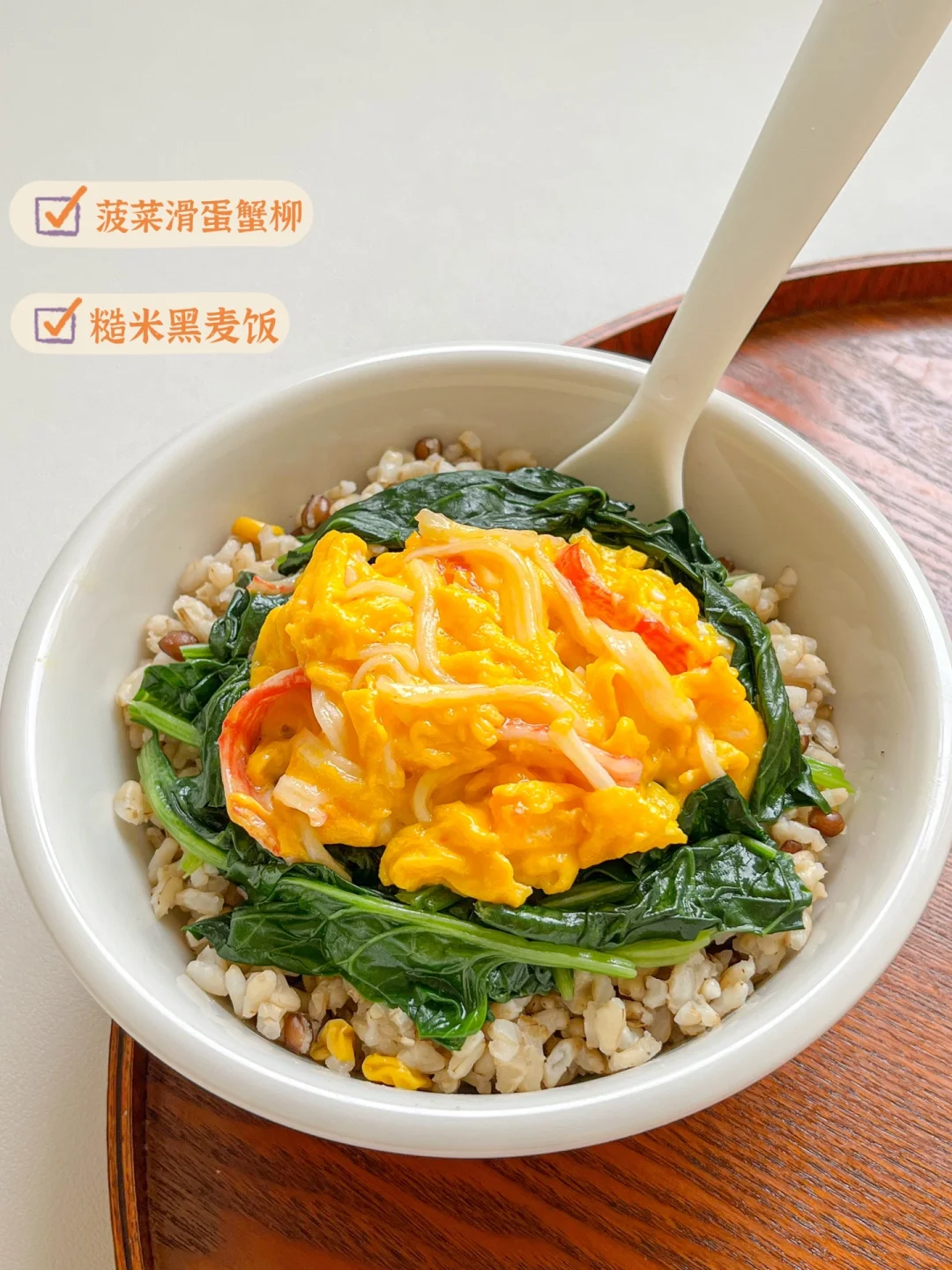 ❶ 菠菜滑蛋蟹柳杂粮饭