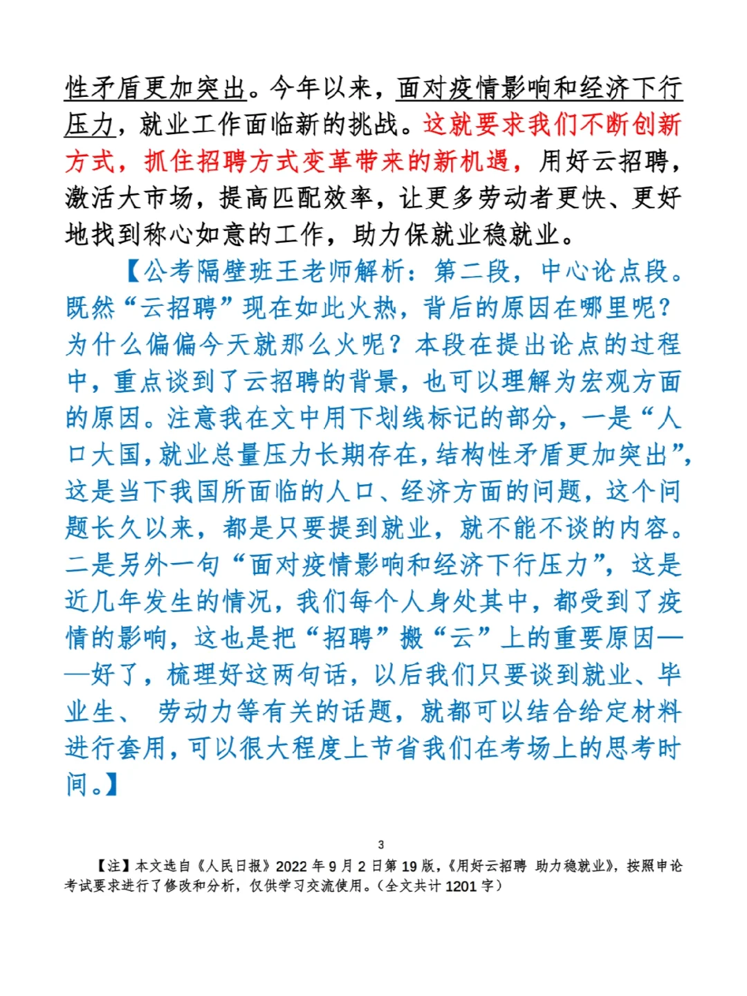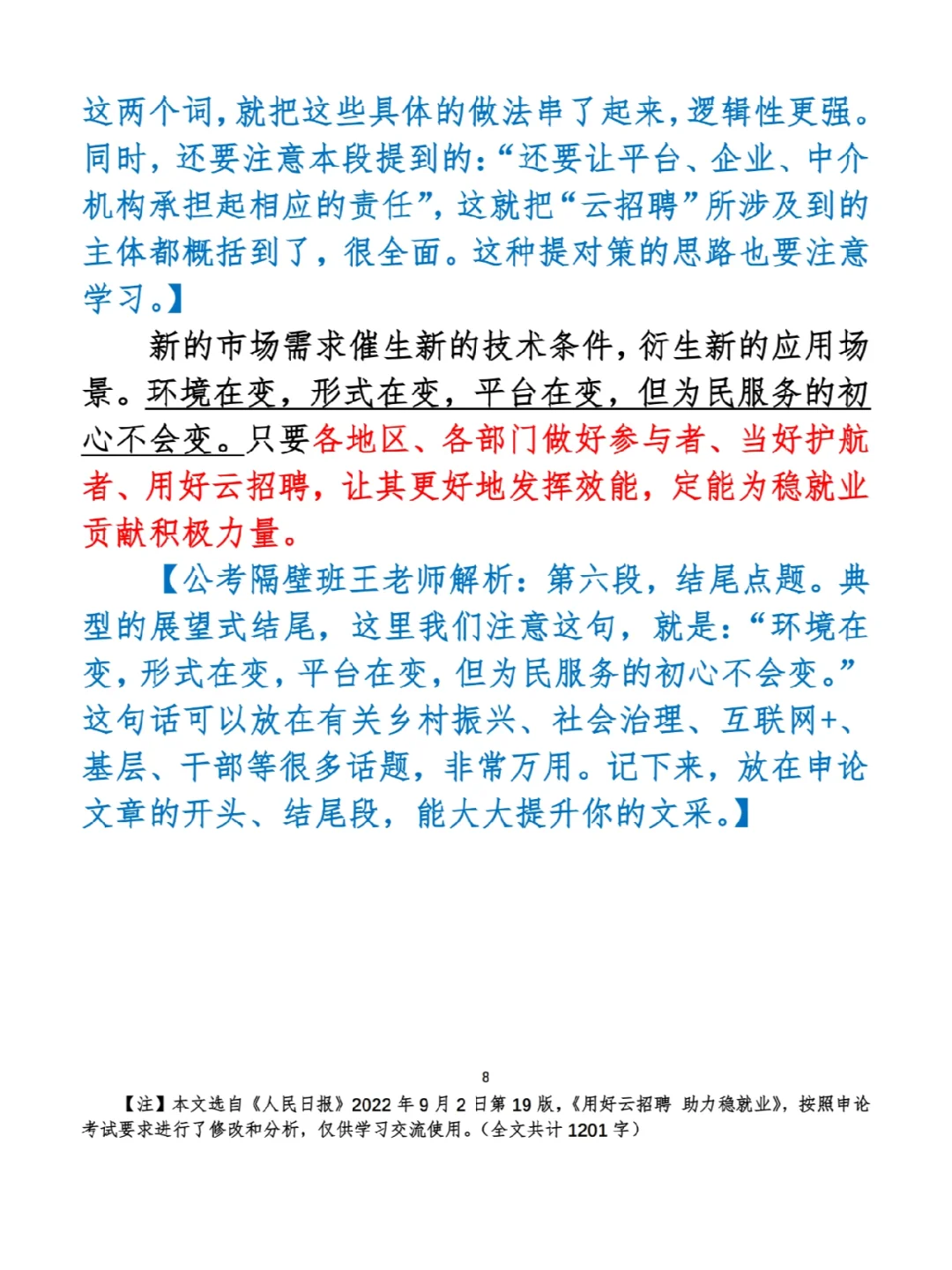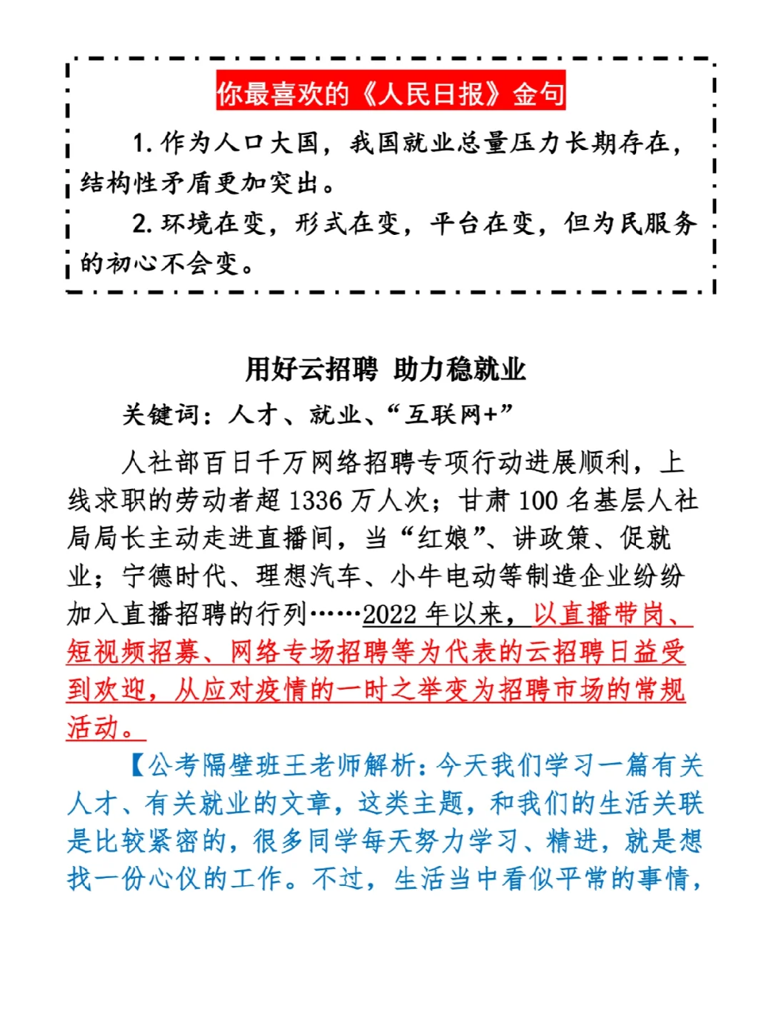 今日打卡作业: 1. 选一句你最喜欢的金句 2. 抄写全文红字+划线部分内容 3. 写完后在留言区打卡 ⭐️ ⭐️ ⭐️ ⭐️ ⭐️ ⭐️ 如何抄写:每天的抄写文章以图片形式发在“公考隔壁班王老师”账号,红色字是重点句和结构句,黑色字是正文,蓝色字是解析,大家抄写时不必抄蓝色字。建议先通读全文(包括蓝色解析部分),做到心中有数再开始抄写,效果会更好。 关于文章:抄写文章来源于人民日报,但每篇文章我都根据申论考试要求进行了修改,主要集中在四个方面:一是重写或修改开头、结尾;二是统一段首句句式结构;三是调整段落字数,使文章结构更均衡;四是简化复杂长难句,使之更具可模仿性。每篇文章修改幅度不同,无论修改多少,都是基于申论考试要求,毫无对人民日报文章品评之意。(此处致敬人民日报) 关于解析:我会在文章每段后面加一段蓝色字的解析,是我自己在抄写时的感悟,篇幅时间有限,不能面面俱到,但求重点突出。如果你有其他感悟,也希望能在评论里分享,我们相互学习、共同进步。 ⭐️ ⭐️ ⭐️ ⭐️ ⭐️ ⭐️ 这里是公考隔壁班王老师独创的“每天半小时・申论80分”抄写团,欢迎加入我们!
