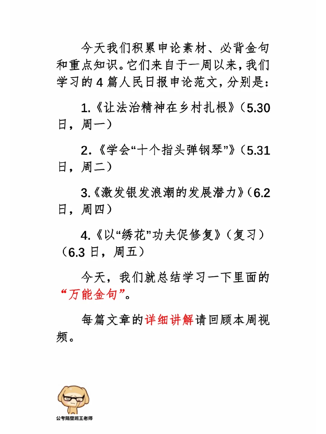 今天我们积累申论素材、必背金句和重点知识。它们来自于一周以来,我们学习的4篇人民日报申论范文,分别是: