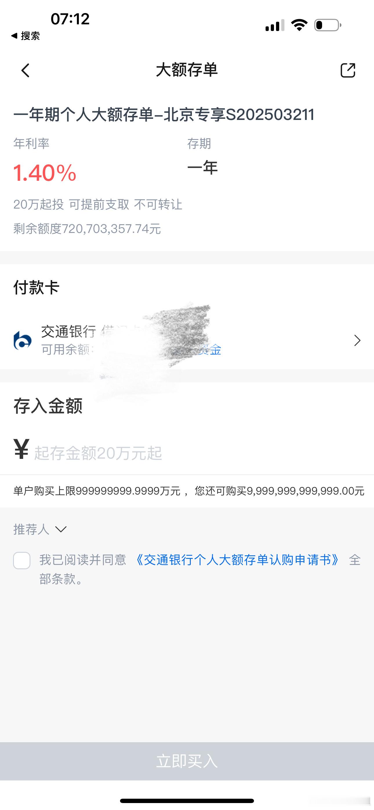 交通银行在手机银行你可以买到1.65%,在柜台可以1.75%,图二是我刚刚买的,另外一年期定存大额存单可以是1.4%!