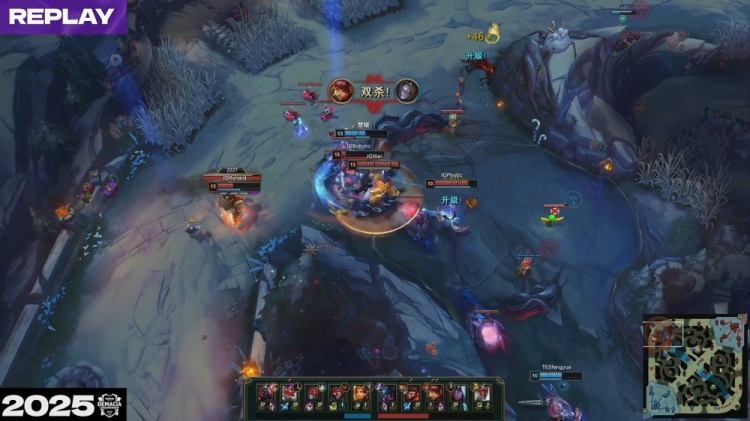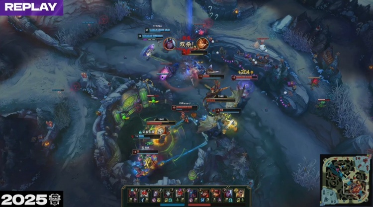 [13:50]Renard安妮上路主动吃ZUIAN赛恩两Q后被naiyiou奇亚娜支援到位击杀,随后Wei猴子河道单杀naiyou奇亚娜。