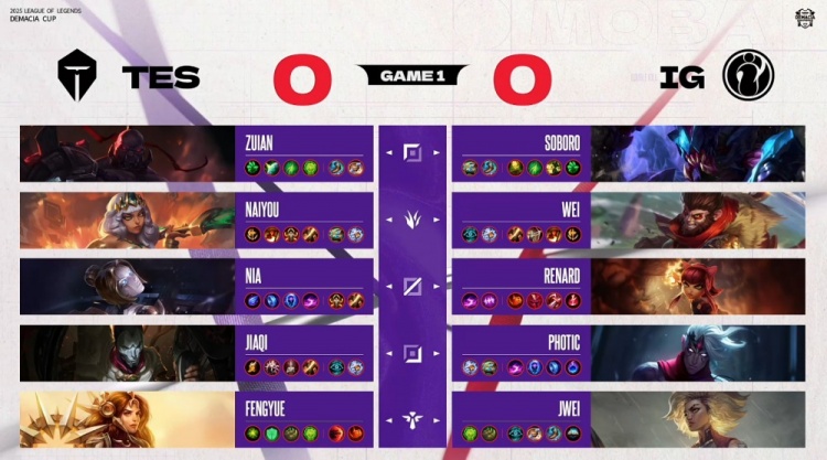 [24:51]野区团战,naiyou逮捕Renard安妮将其单杀,Wei猴子被JiaQi烬开大狙掉,naiyou再杀Jwei芮尔,上路思念叫曹naiyou打出Photic韦鲁斯闪现,Photic韦鲁斯上路草丛找人单杀naiyou后被JiaQi烬点掉,soboro送JiaQi烬双杀,TES打出1换4,双方经济持平。