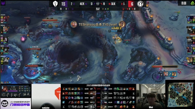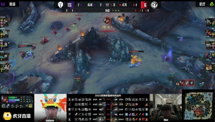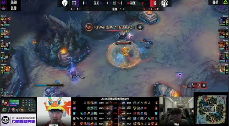 [20:23]TES来开厄塔汗,naiyou吃掉厄塔汗后再杀Jwei芮尔,jiaQi烬又被击杀,Wei猴子开大进场与Renard安妮绕后各取双杀,iG打出2换4,推掉TES上路二塔与中路一塔,并听牌炼金龙魂,iG经济领先1k。