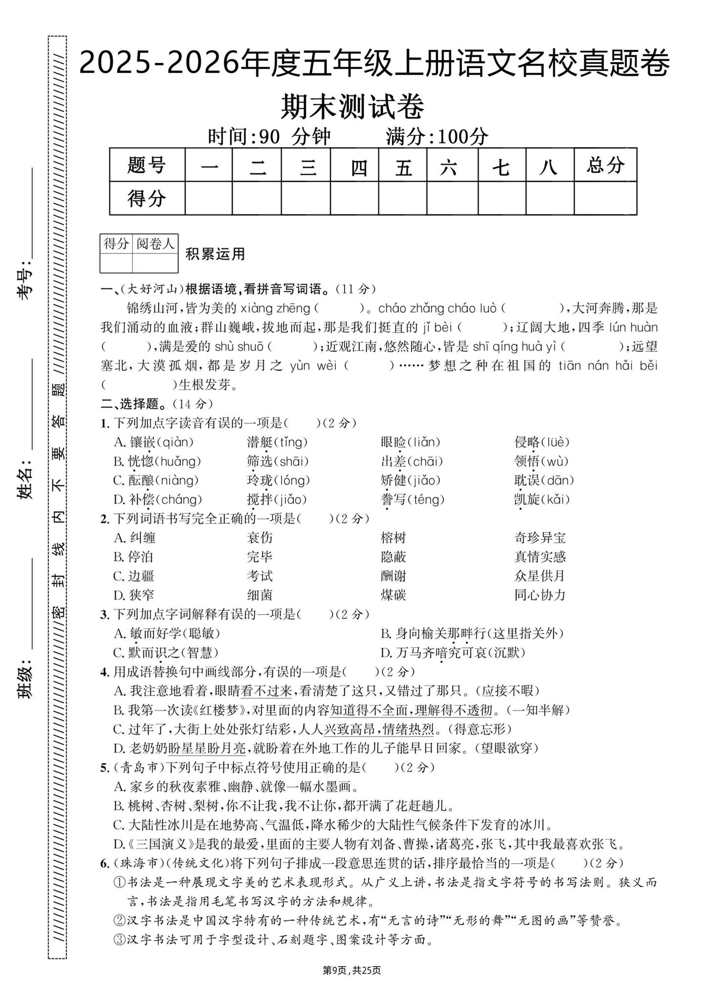 2025五年级上册期末考测试卷压题,语文数学附带答案,有需要的可自行下载打印。