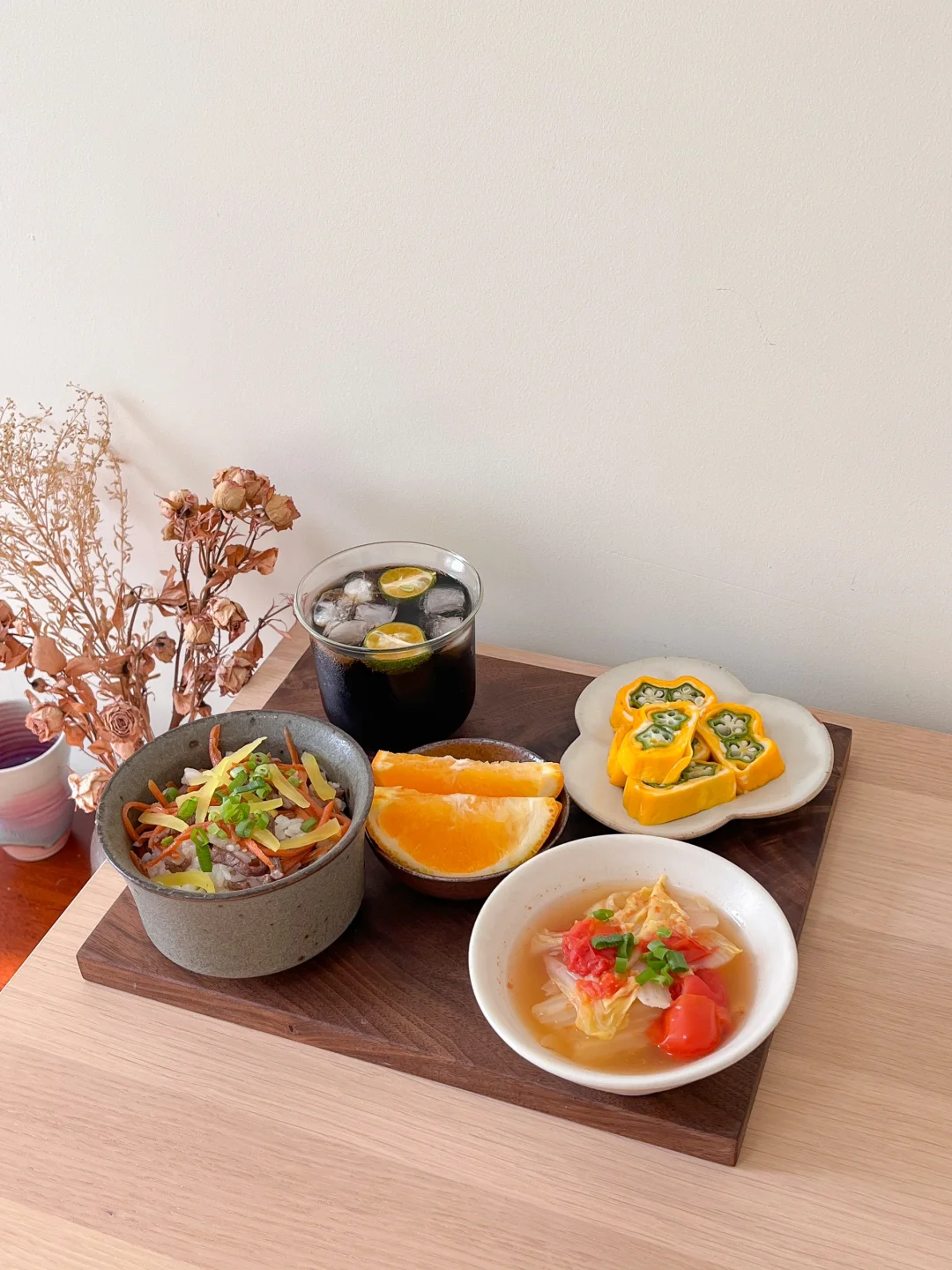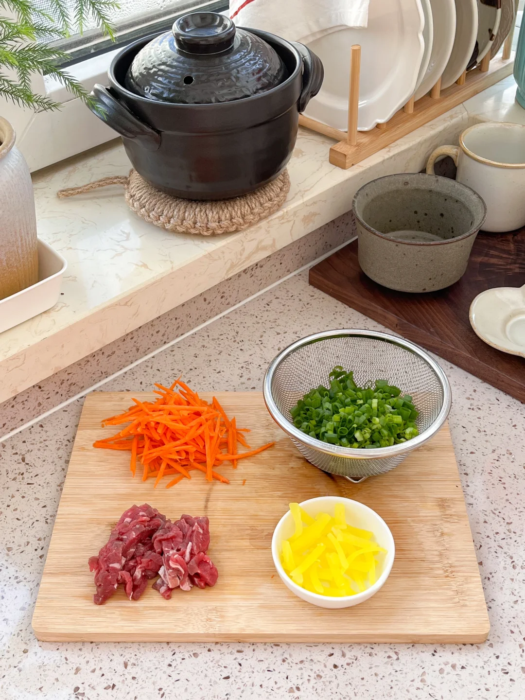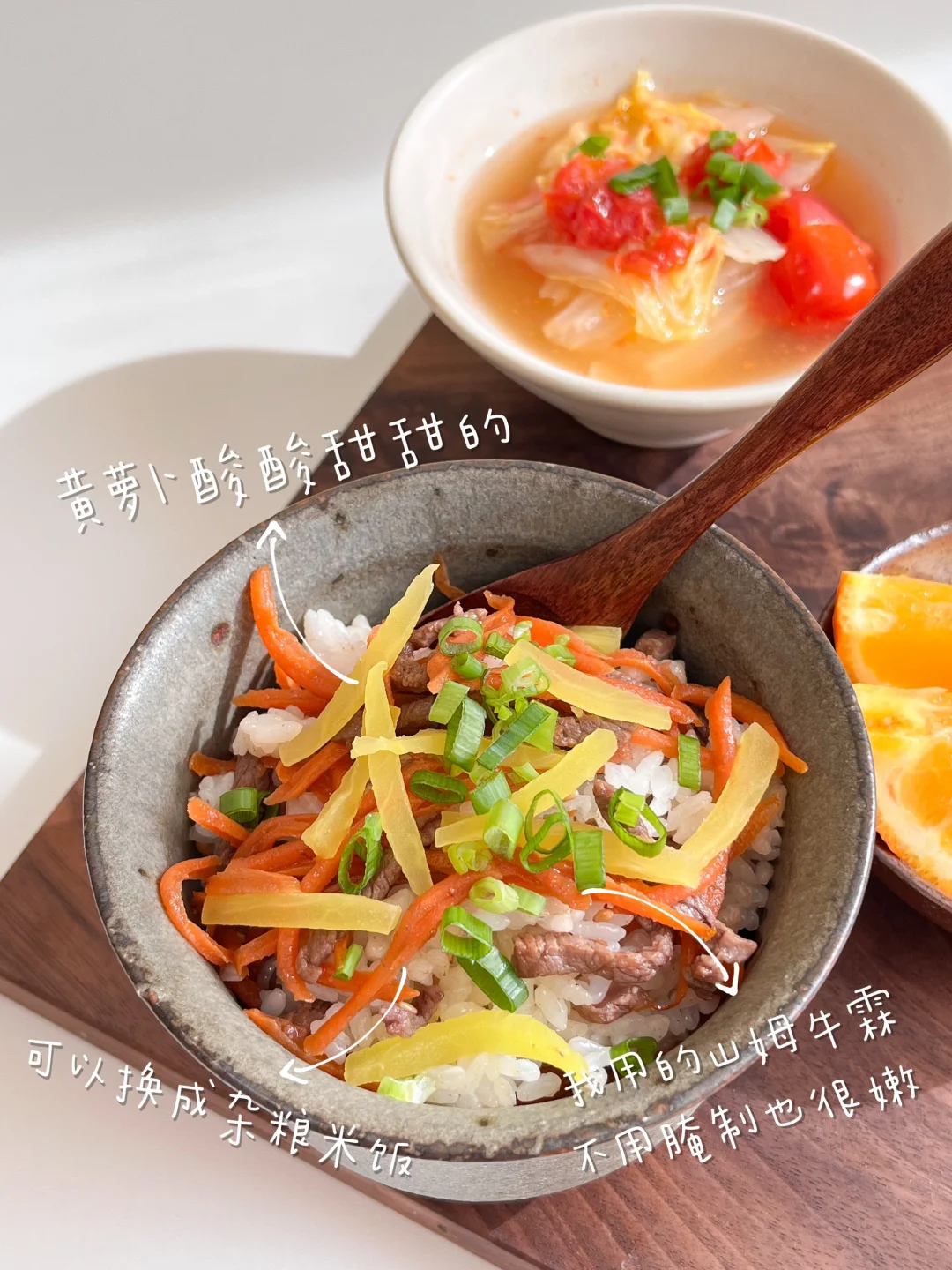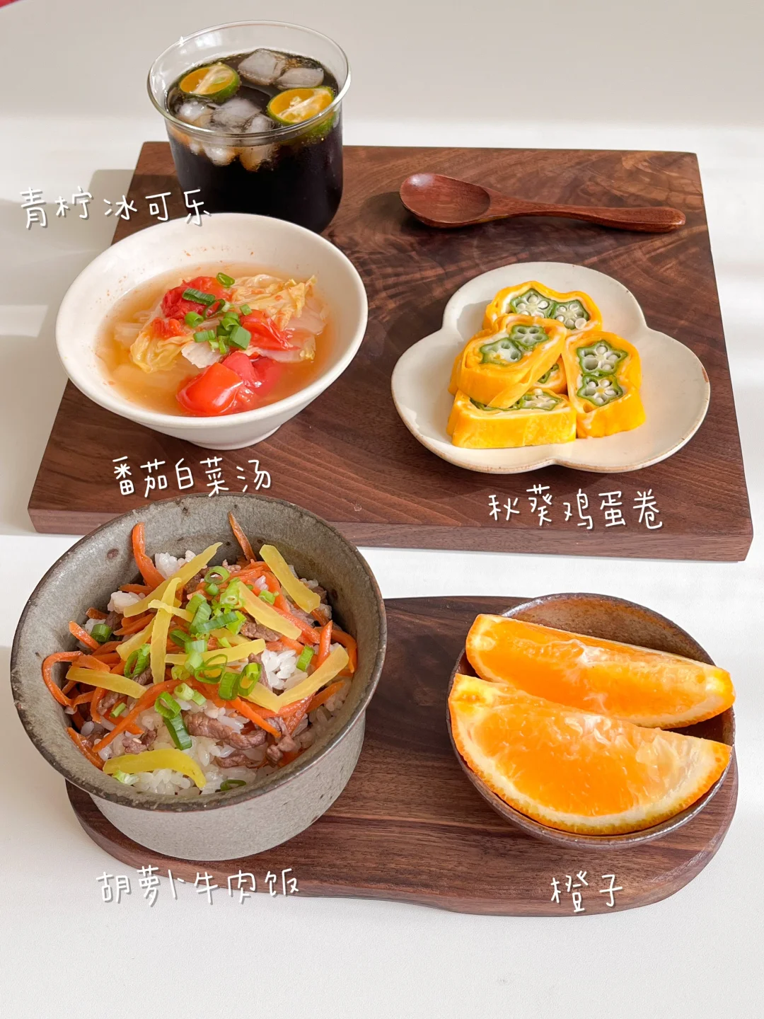 “节后每天我都会来一碗无油的蔬菜汤,可以多吃蔬菜也很有饱腹感。” 今日午餐: ¹胡萝卜牛肉饭 ²番茄白菜汤 ³秋葵鸡蛋卷 ⁴青柠冰可乐 蔬菜汤里加一点番茄 汤底浓郁 酸酸的还开胃 就是冬天的番茄太难吃了 我get了一个好办法 就是用小番茄 小柿子 味儿特别正 个头小小的 放几颗就够煮一碗汤了 也不担心一整个西红柿吃不完 适合小饭量 家里还有点做寿司用的黄萝卜 和胡萝卜、牛肉一起做了一碗好吃的拌饭 牛里脊切丝和胡萝卜炒熟 加上白芝麻 拌上热乎乎的米饭 再来一点黄萝卜 酸酸甜甜的可好吃了😋