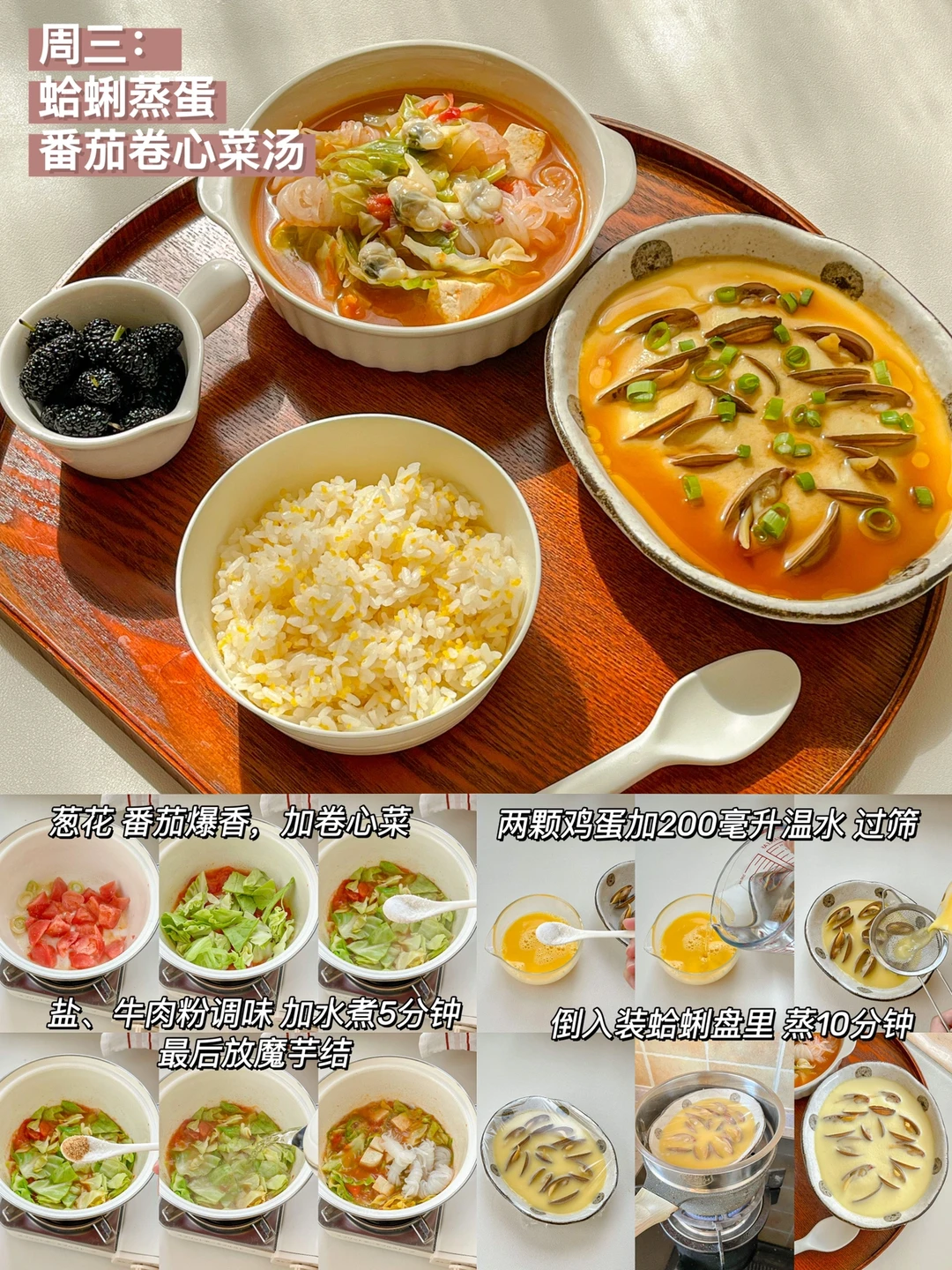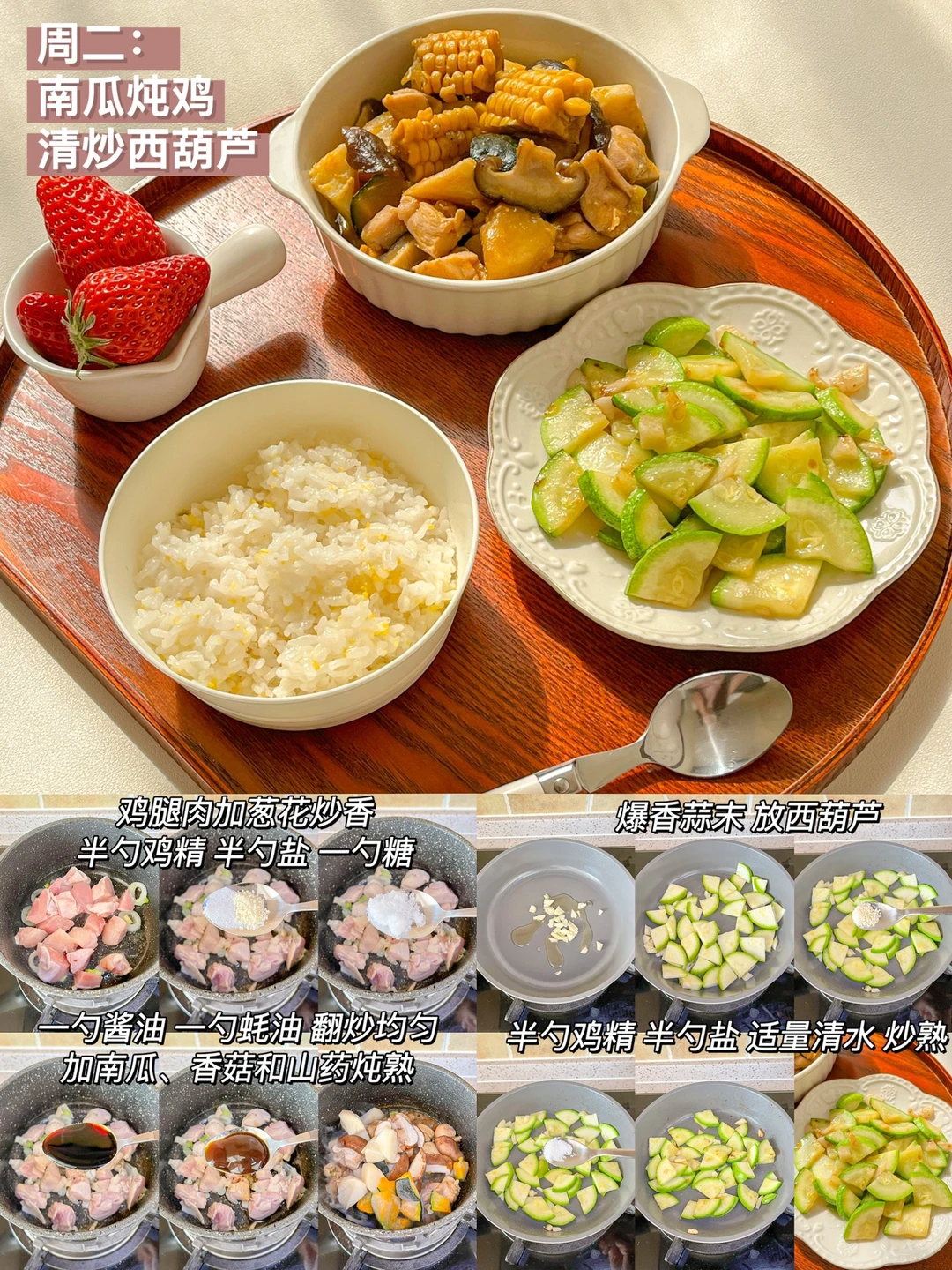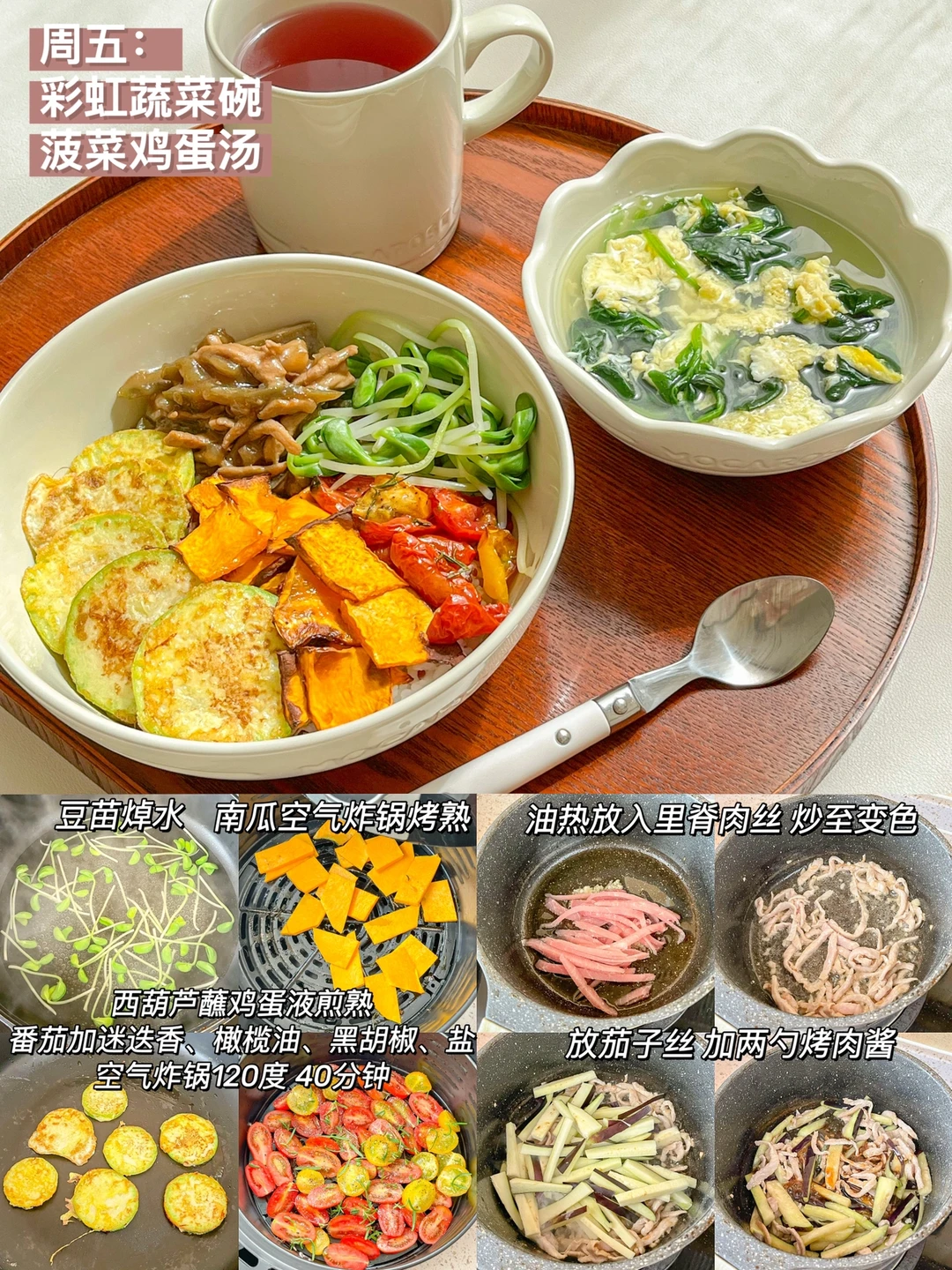 “春天真的是看见阳光就超级幸福的季节,一起吃一顿健康的午餐吧!” ❤白菜豆腐泡+肉馅杏鲍菇+肉段 ️🧡南瓜炖玉米鸡+清炒西葫芦+草莓 💛蛤蜊蒸蛋+番茄卷心菜汤+桑葚 💚海参蒸蛋+蒸茄子+豆苗豆腐汤 💙彩虹蔬菜碗+菠菜鸡蛋汤+蔓越莓果粉 💜油浸番茄虾+煎姬松茸+南瓜山药