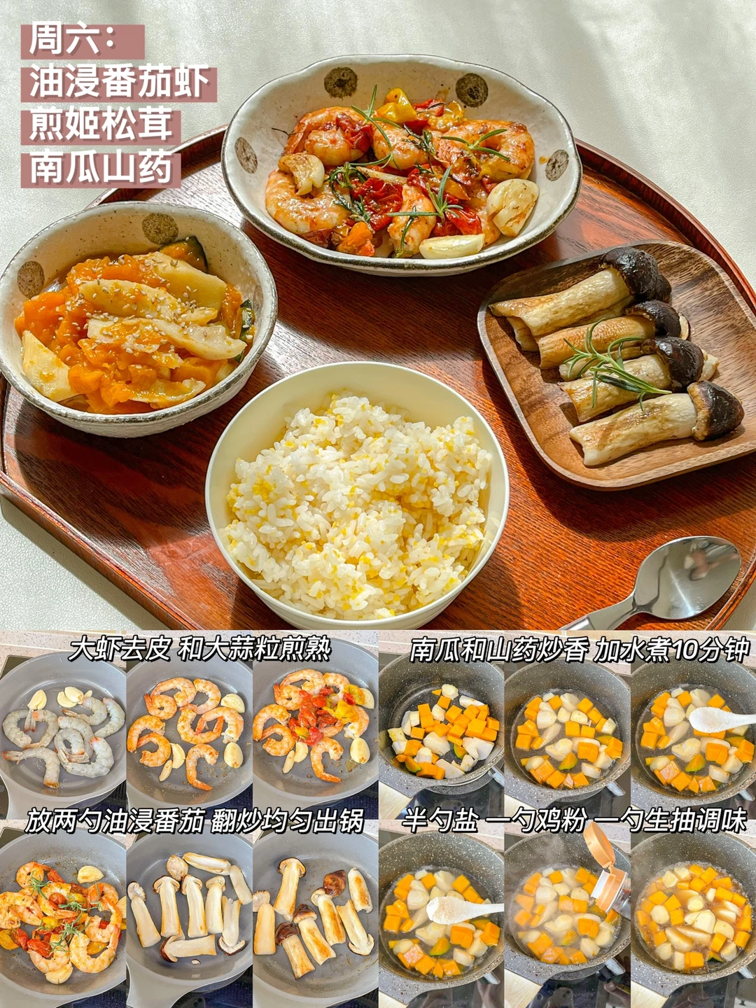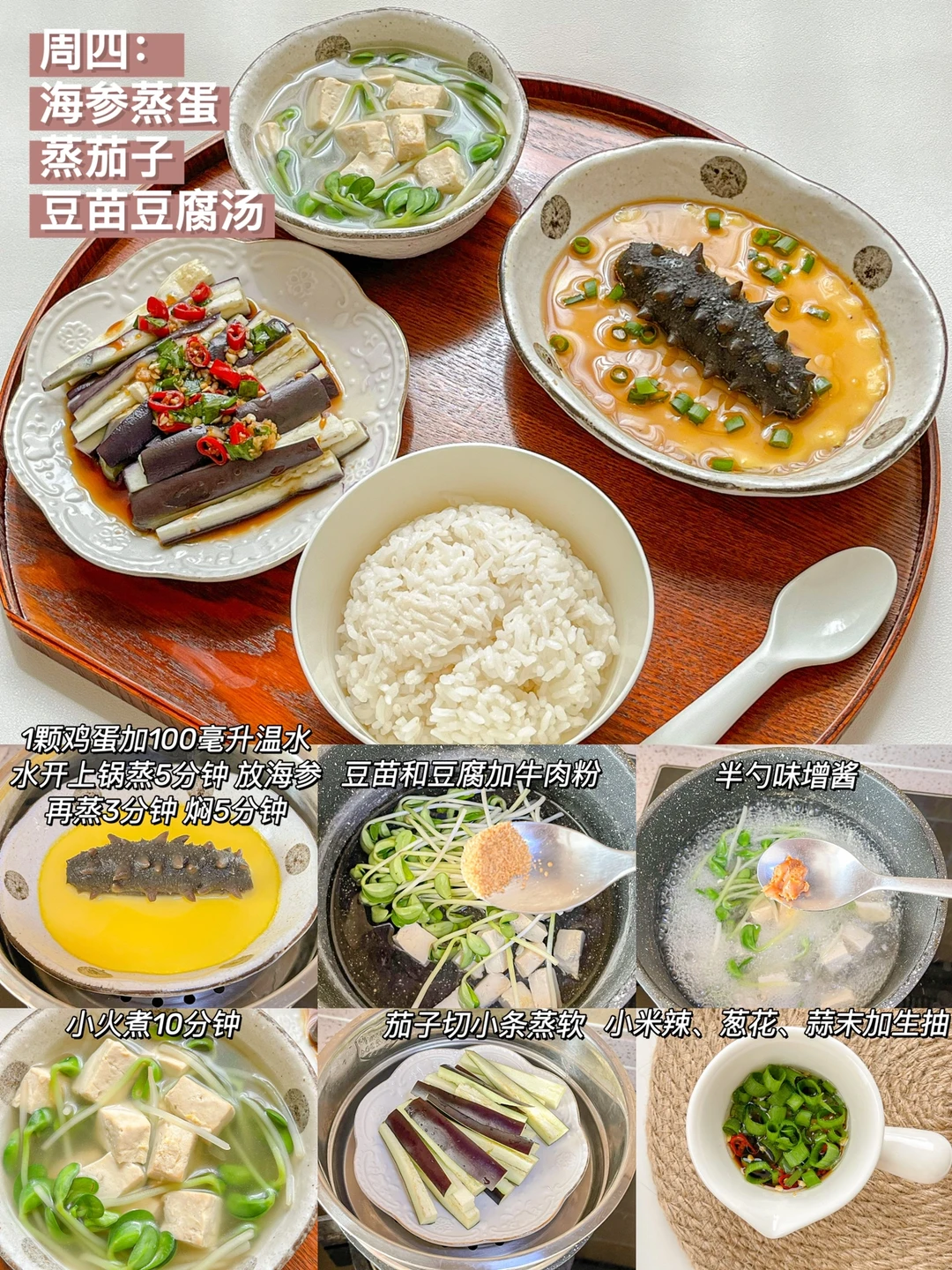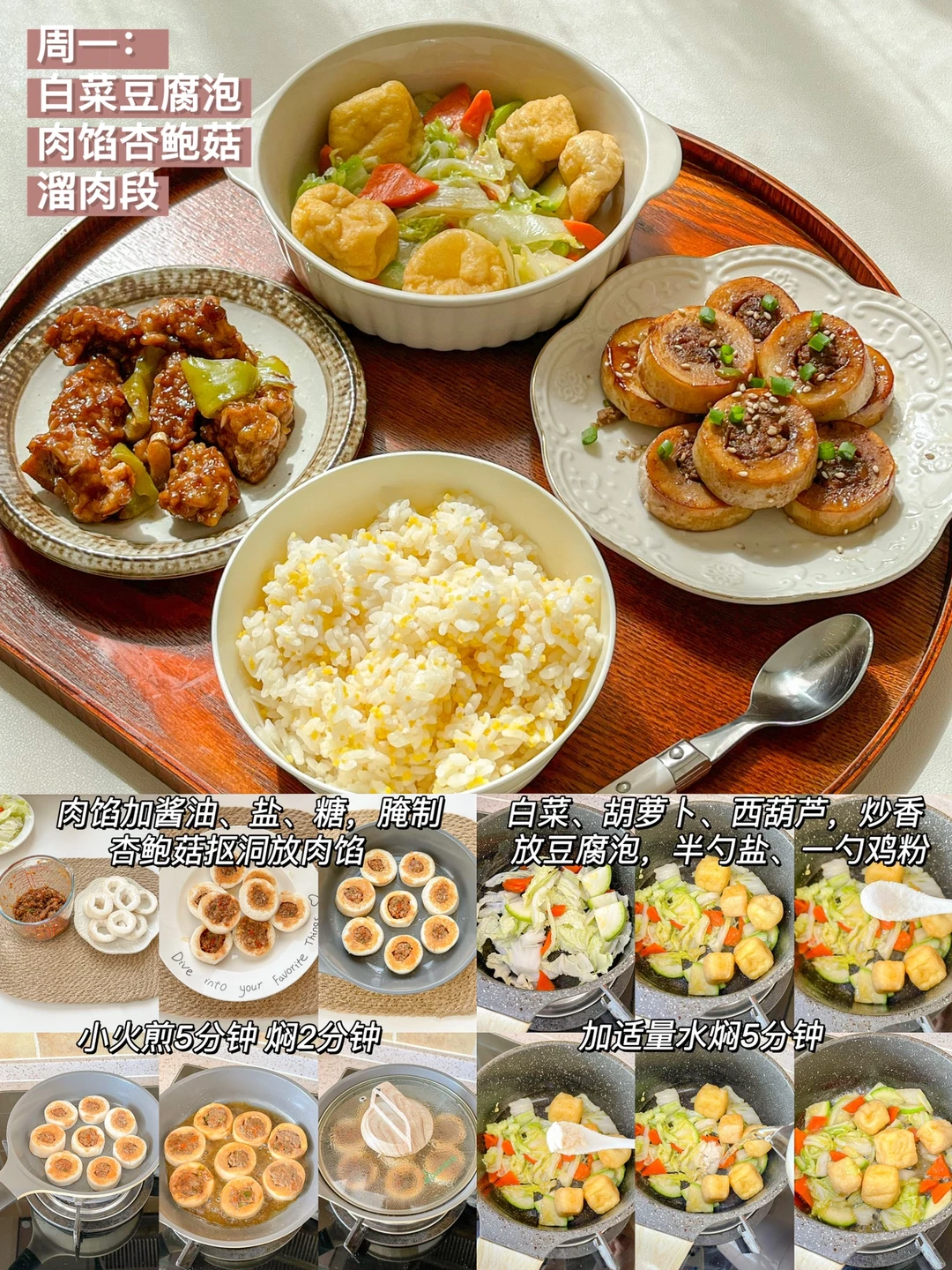 “春天真的是看见阳光就超级幸福的季节,一起吃一顿健康的午餐吧!” ❤白菜豆腐泡+肉馅杏鲍菇+肉段 ️🧡南瓜炖玉米鸡+清炒西葫芦+草莓 💛蛤蜊蒸蛋+番茄卷心菜汤+桑葚 💚海参蒸蛋+蒸茄子+豆苗豆腐汤 💙彩虹蔬菜碗+菠菜鸡蛋汤+蔓越莓果粉 💜油浸番茄虾+煎姬松茸+南瓜山药