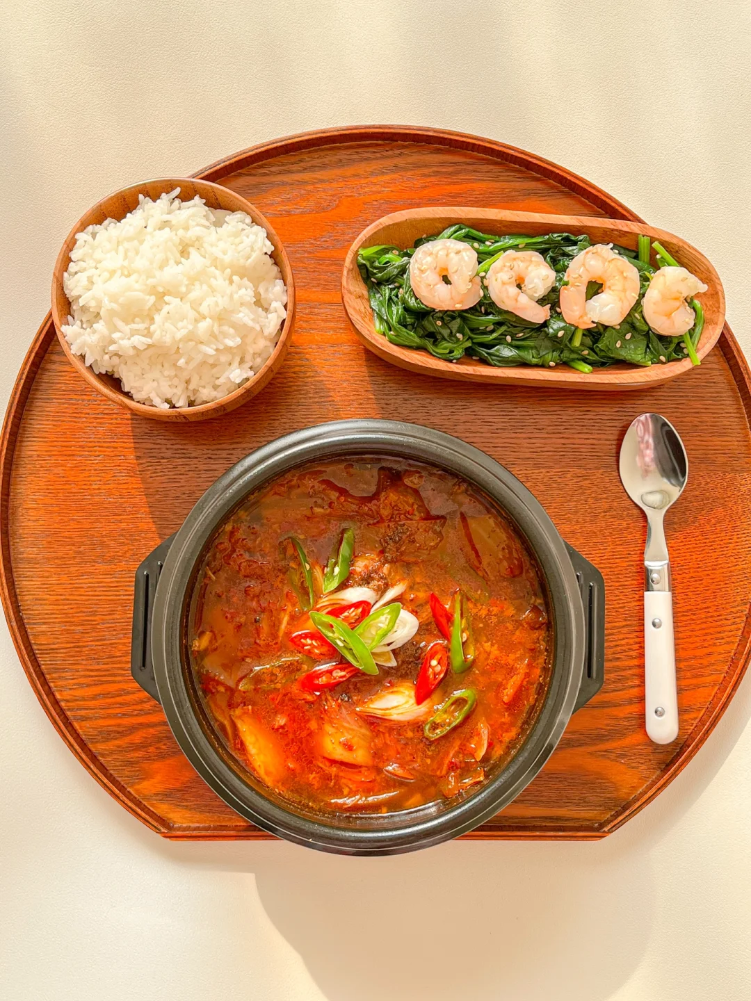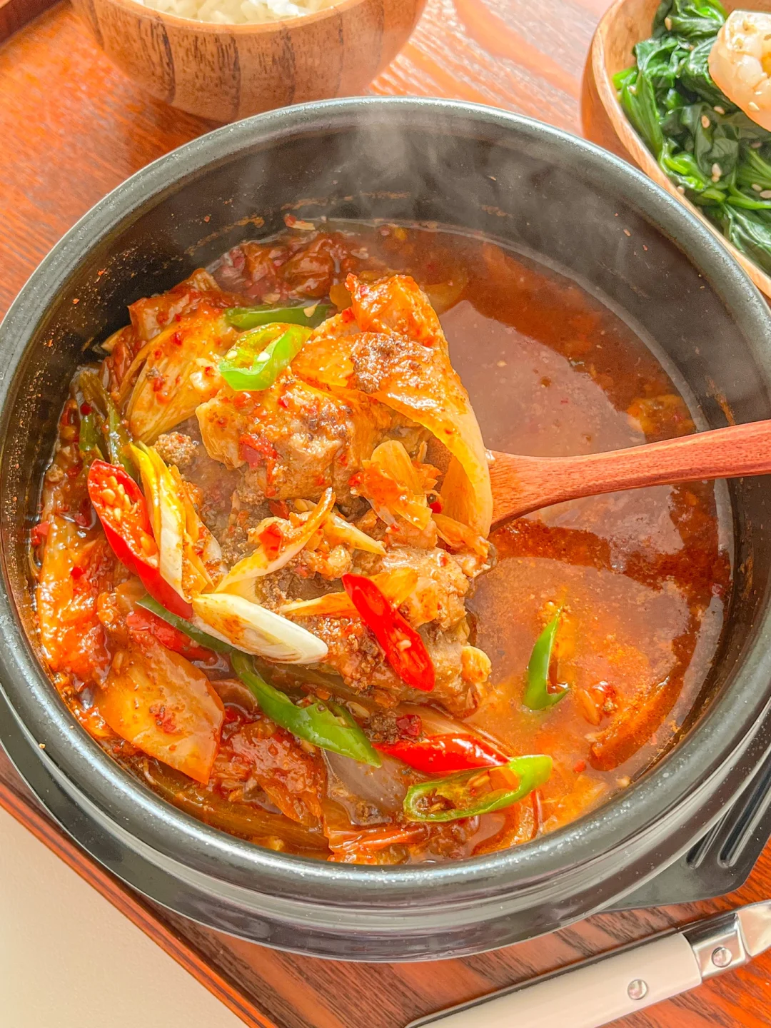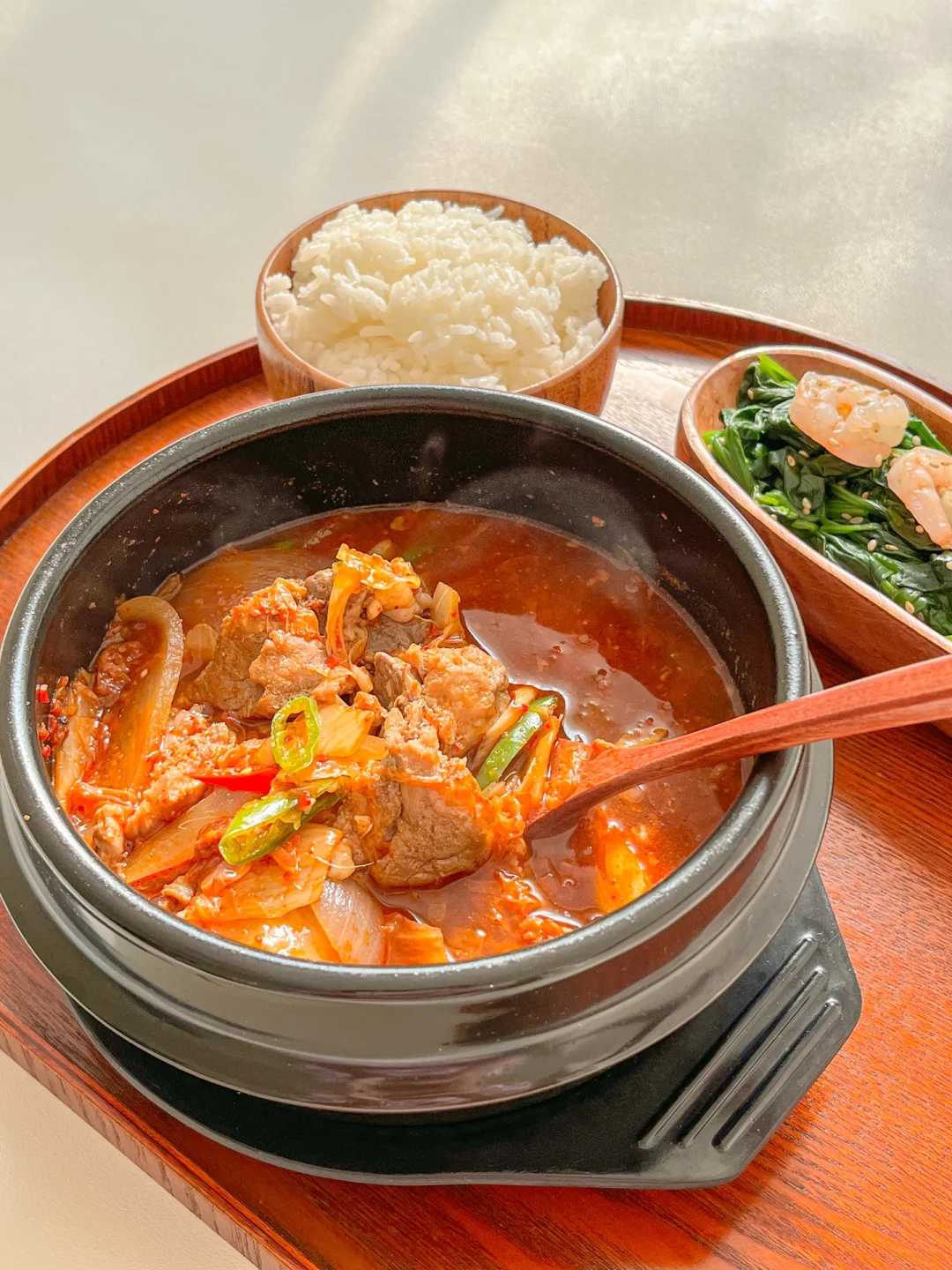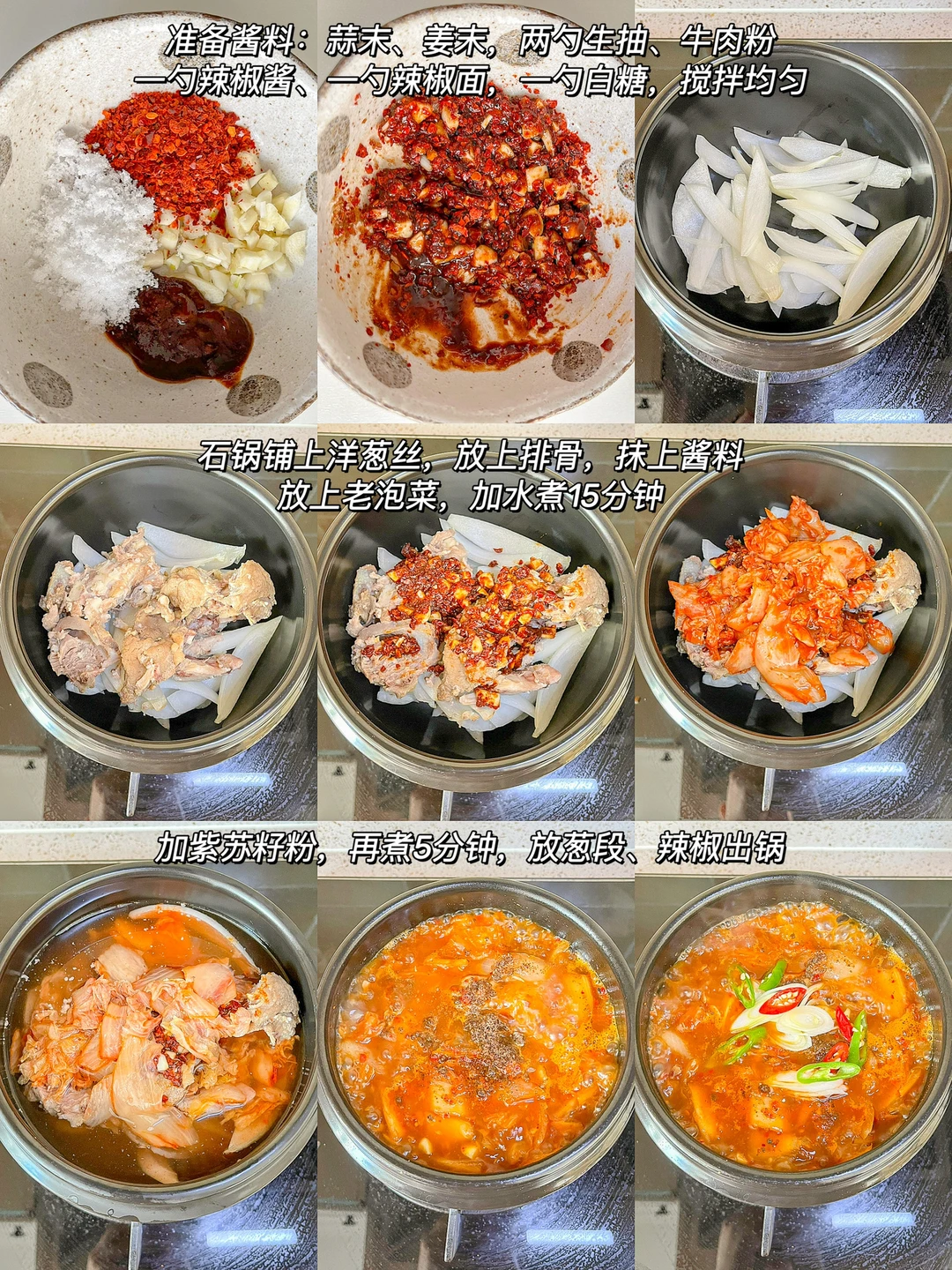 3.石锅铺上洋葱丝,放上排骨,抹上酱料,放上老泡菜,加水煮15分钟